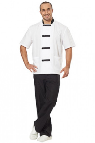 Современный костюм для сферы услуг Свободный силуэт Центральная застежка на навесные петли и пуговицы в цвет отделки Воротник-стойка Нижние накладные карманы с логотипом Карман для ручек на рукаве Рукав короткий Боковые разрезы Регулировка по талии брюк Шлевки для пояса Гульфик на молнии Заутюженные стрелки Боковые карманы Цвет белый с черной отделкой Ткань смесовая, пл. 120 гр/м²; Отделка верха: «Панацея Премиум» (65% полиэфир, 35% вискоза), пл. 155 гр/м²