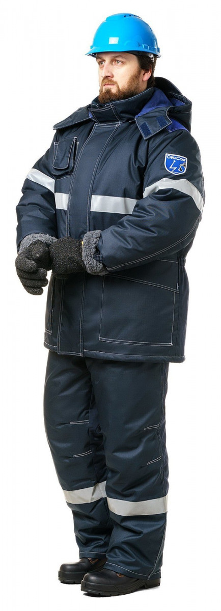 Куртка прямого силуэта с центральной бортовой застежкой на молнию и ветрозащитным клапаном с потайной застежкой на 5 пуговиц, воротником - стойкой, с капюшоном, пристегивающимся на молнию и застегивающимся на контактную ленту, с пристегивающейся утепляющей подкладкой, стягивается по низу эластичным шнуром с фиксаторами. Полочки с боковыми накладными объемными карманами с клапанами, с нагрудными карманами для пропуска и телефона, застегивающимися на контактную ленту, с внутренней ветрозащитной планкой. Полукомбинезон прямого силуэта с центральной застежкой – молнией и ветрозащитным клапаном, застегивающимся на контактную ленту, с грудкой и спинкой, бретелями с эластичными вставками, застегивающимися на фастексы, с эластичной тесьмой по талии спинки, с боковыми карманами, с пристегивающейся утепляющей подкладкой.