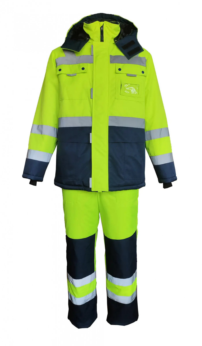 с центральной застежкой на молнию, закрытая ветрозащитной планкой на липучку с накладными карманами и клапанами на кнопках и карманом для бейджа нижними накладными карманами и внутренним карманом на подкладке с ветрозащитной юбкой на подкладке и утяжкой по низу куртки с воротником – стойка, внутренний воротник из тк. Флис съёмный капюшон с регулировкой объёма по лицевой части и возможность использования капюшона на каску трикотажные манжеты Ткань верха: «Nordika» полиэфир ТПУ мембрана, ВО пропитка состав: 100% ПЭ, пл. 170 г/м2±5г/м2 Ткань подкладочная: «Тафета 190», состав: 100% ПЭ, пл. 55 г/м2±10г/м2 Утеплитель: «Слайтекс»-120г/м2, в куртке 480 г/м2 (4слоя корпус, 3слоя рукав), в полукомбинезон 360 г/м2(3слоя) Рост, см: 170-176, 182-188 Размеры: с 88-92 по 120-124 Цвет: желтый (лимонный) с темно-синим ГОСТ: ГОСТ 12.4.303-2016, ГОСТ 12.4.281-2014