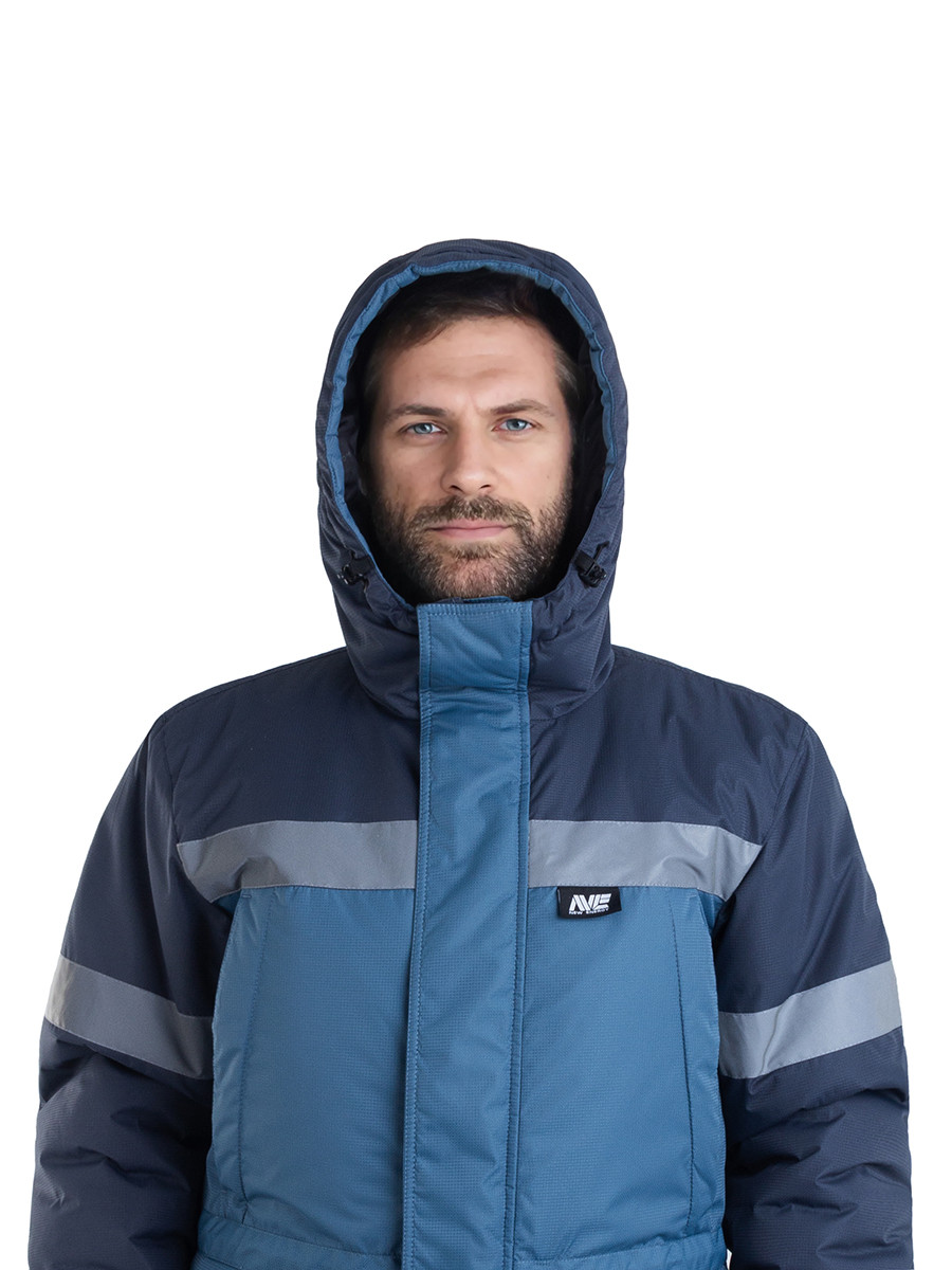 Куртка с высоким воротником и несъемным капюшоном с регулировкой по высоте и глубине.