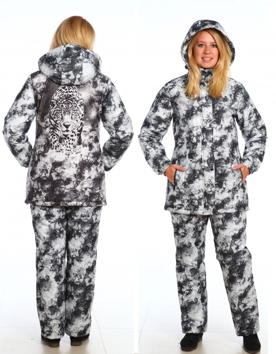 Костюм женский зимний Барс выполнен из мембранной ткани (не шуршащей). Куртка приталенного кроя с утяжками в зоне талии и снизу, с застежкой на молнию. Молния закрывается ветровлагозащитной планкой на 4-х кнопках. На куртке имеются три кармана: один внутренний на молнии и два нижних кармана, утепленных флисом на водонепроницаемой молнии. На спине куртки имеется рисунок снежного барса. Съёмный капюшон на молнии, регулируется резинкой с фиксаторами, утепленный. Манжеты на рукавах выполнены на резинке. Воротник типа - стойка. Подкладка воротника из флиса. В куртке используется утеплитель Слайтекс®, плотностью 300 гр/кв.м. и внутренняя подкладка из флиса. Полукомбинезон на молнии с регулирующимися по росту лямками - подтяжками на пластиковых защелках. Полукомбинезон имеет два накладных кармана, утепленных флисом. Подкладка полукомбинезона - таффета.