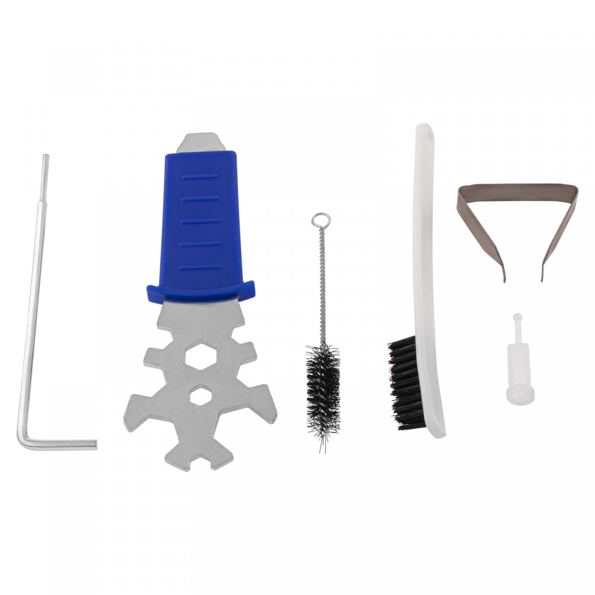 • Необходимые аксессуары в комплекте — краскопульт поставляется с дюзовым набором диаметром 1,3 мм, ершиком для очистки и универсальным ключом.