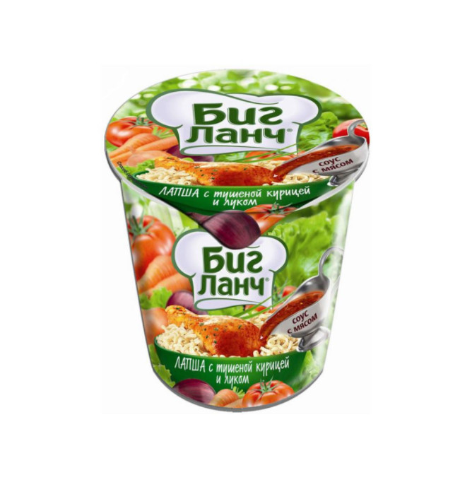 Лапша «Биг Ланч» с тушеной курицей и луком - вкусное, а главное быстрое в приготовлении блюдо. Достаточно лишь залить кипятком на 5-10 минут, и Вы получите аппетитный сытный обед. Также лапшу можно использовать в качестве дополнения к основу блюду, либо же наоборот - дополнить ее другими продуктами, например половинку яйца или же кусочек мяса, дабы сделать трапезу еще вкуснее и сытнее!