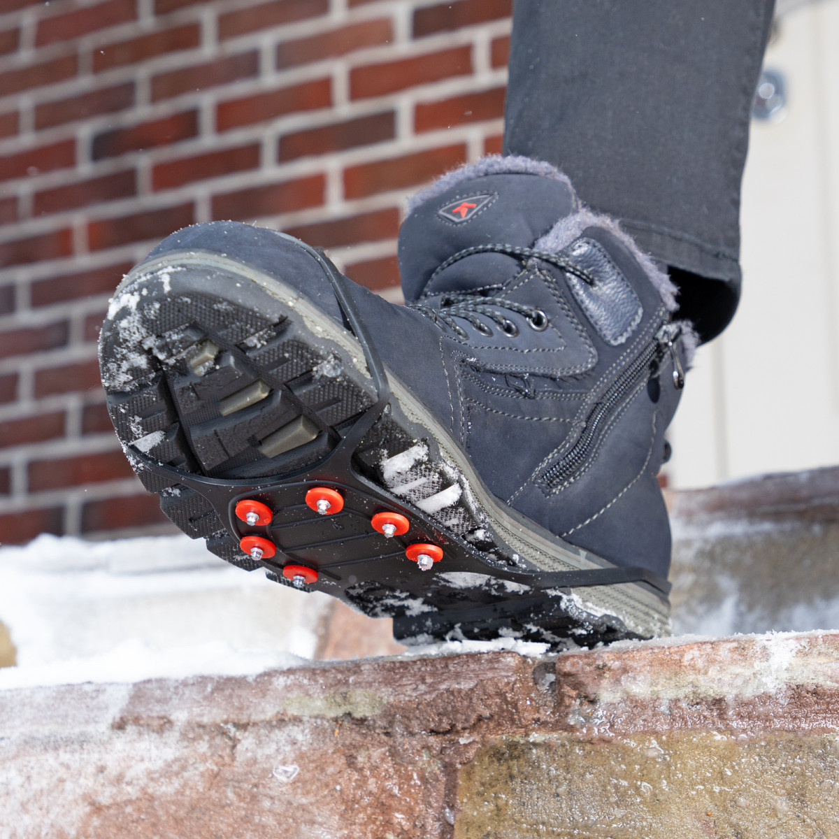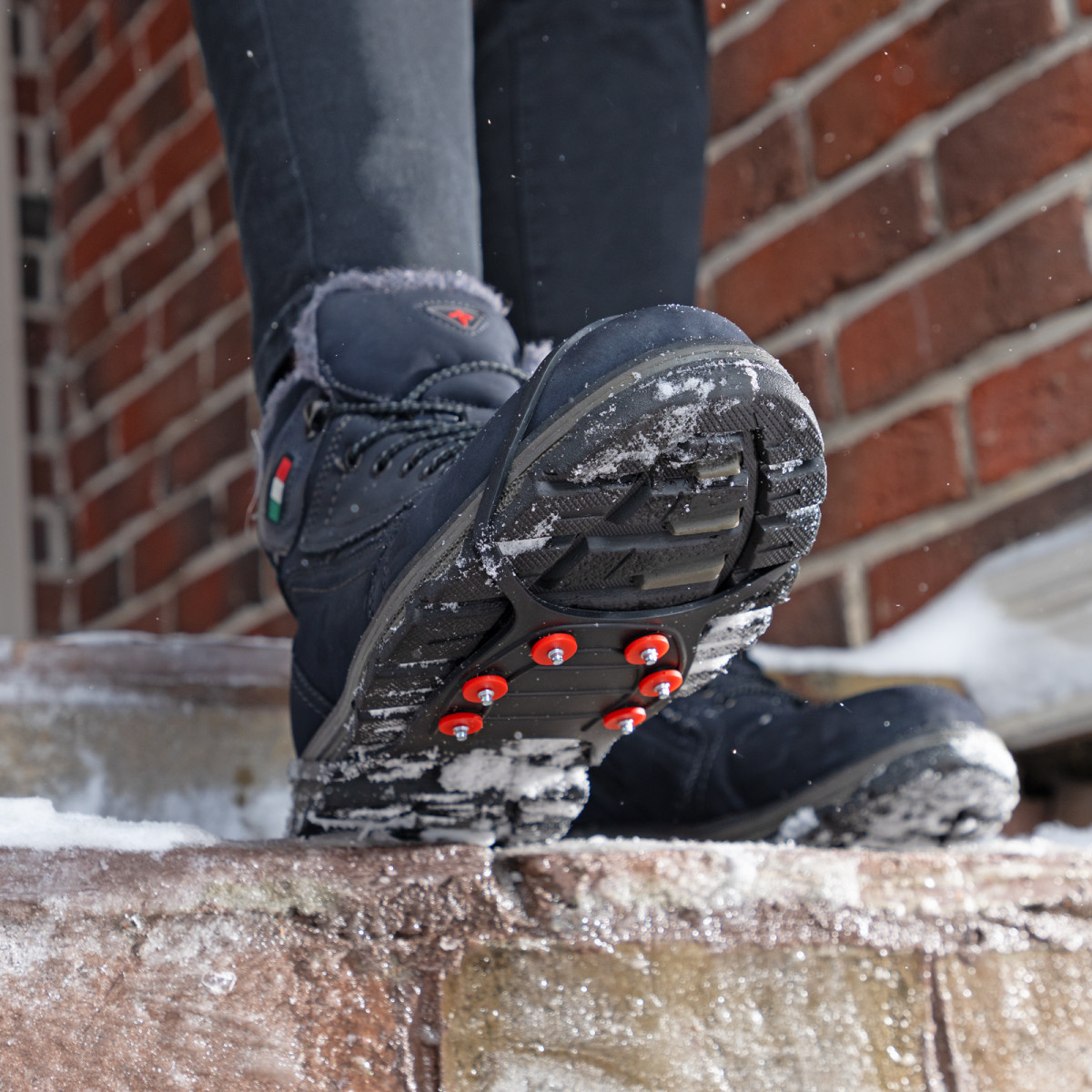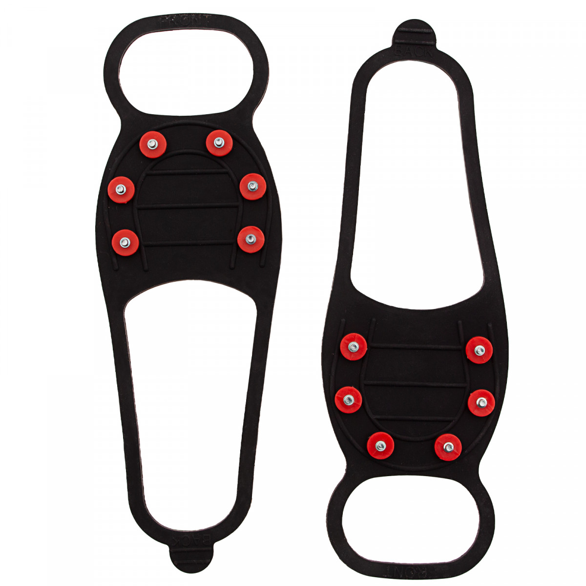 - Стальные шипы не гнутся и не истираются, а заостренные зубцы глубоко проникают в лед, исключая падение человека.