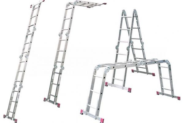 Eниверсальная лестница из четырех частей для профессионального и полупрофессионального использования. Отличительной особенностью лестницы — трансформера является широта возможных позиций, в которых её можно использовать, что даёт гибкость в работе, а также компактность, что позволяет легко перемещать и транспортировать эту лестницу. Направляющие и ступени имеют дополнительные ребра жёсткости.Траверса крепится к основанию лестницы прочными стальными болтами, что позволяет её снимать и крепить обратно.Для профессионального и полупрофессионального использования.