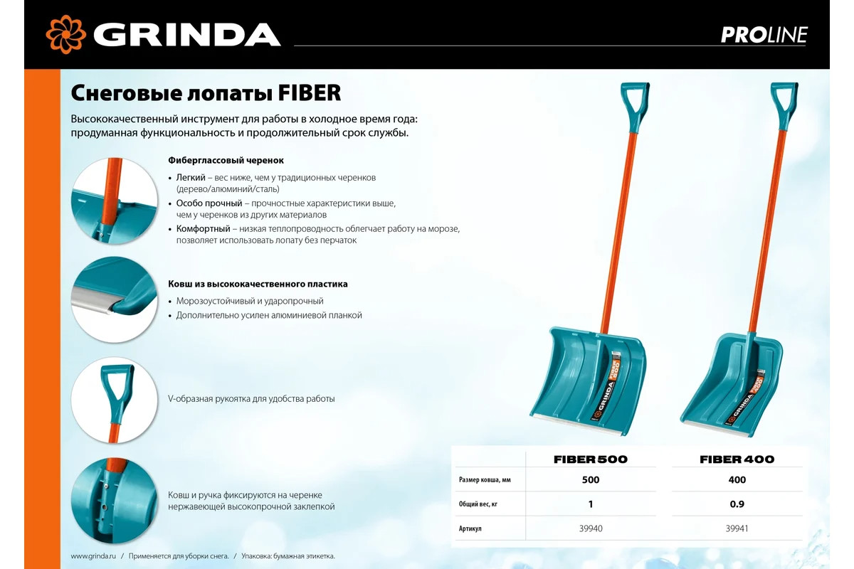 Пластиковая снеговая лопата Grinda PROLine Fiber-500 500 мм 39940 подходит для очистки территории от снега. Этот высококачественный инструмент создан специально для работы в холодное время года и сочетает в себе продуманную функциональность и продолжительный срок службы. Надежность. Рабочая часть лопаты изготовлена из морозоустойчивого ударопрочного пластика и имеет алюминиевую окантовку, защищающую кромку рабочей поверхности от повреждений. Эргономичный стеклопластиковый черенок с v-образной рукояткой обеспечивает удобство использования. -Особо прочный и одновременно легкий фибергласовый черенок. -Позволяет комфортно работать на морозе без перчаток. -V-образная рукоятка для удобства работы. -Ковш из высококачественного пластика, морозоустойчивый и ударопрочный. -Ковш дополнительно усилен алюминиевой планкой.