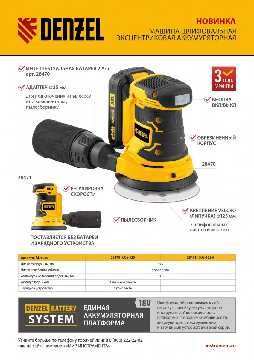 Машина шлифовальная эксцентриковая аккумуляторная COS-125-0, 18В Li-Ion Denzel