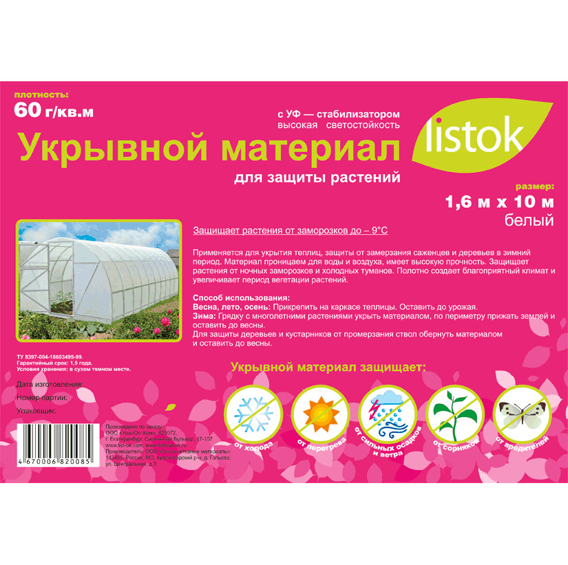 Материал укрывной LISTOK суф-60 1,6*10м/16 белый
