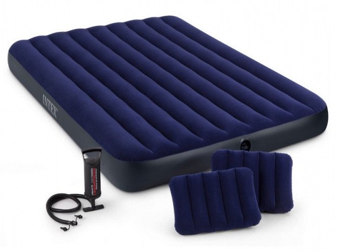 Флокированное покрытие матраса не даёт соскальзывать белью, и в то же время легко чистится. В комплекте две надувные подушки , ручной насос и самоклеящаяся заплатка.