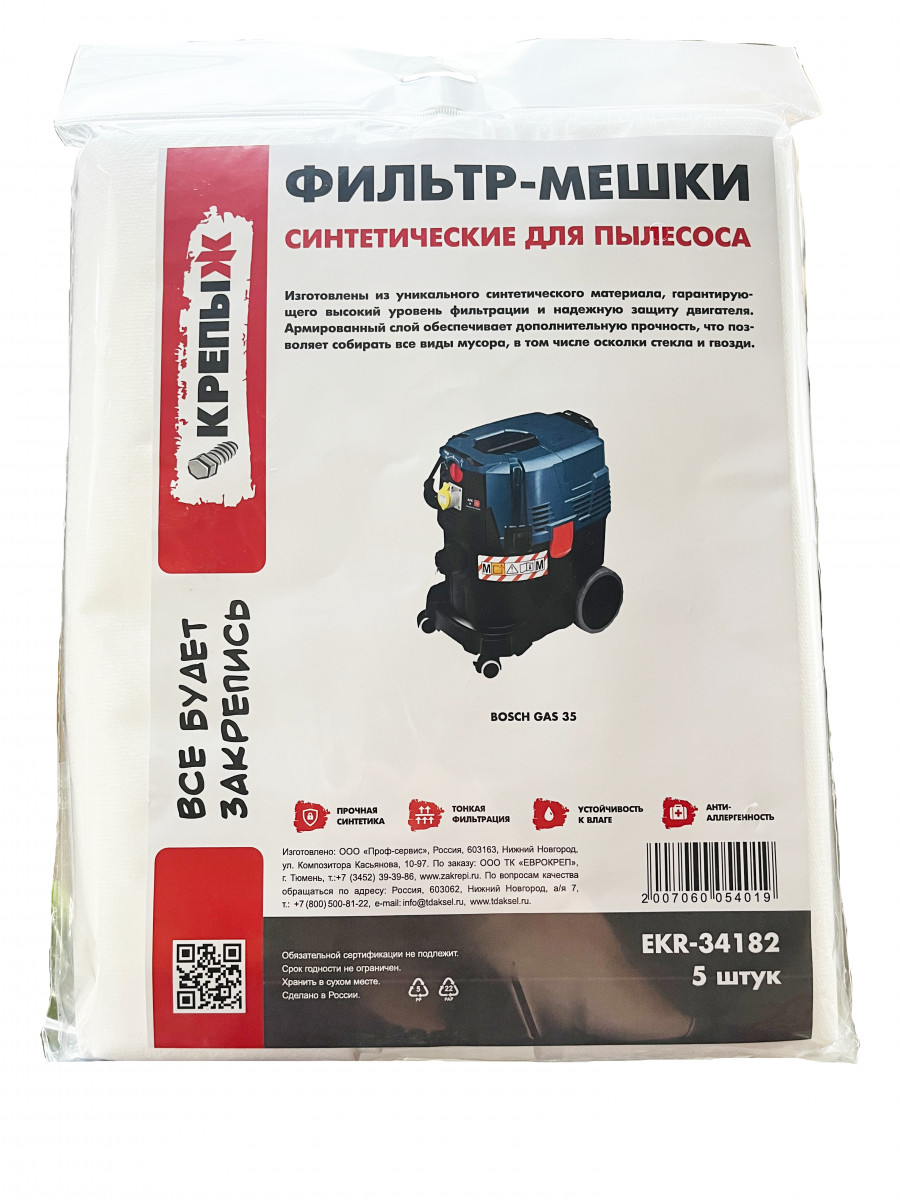 Мешок-пылесборник КРЕПЫЖ для пылесосов синтетический 5 шт,EKR-34182 (до 36 л)
