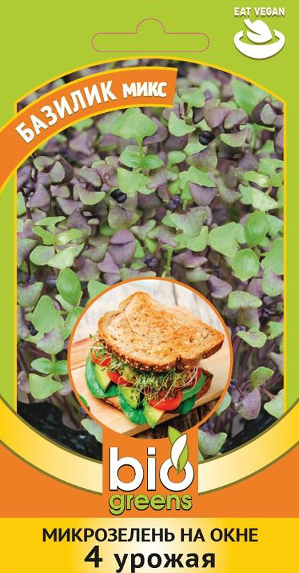 Зеленые островатые ростки с пряным ароматом. Содержат эфирные масла, витамины А, Р, В2, С, каротин, рутин и фитонциды. Молодые листочки добавляют в свежие салаты, овощные супы, в гарниры к мясу и рыбе. Микрозелень базилика обладает антисептическим и противовоспалительным действиями, укрепляет стенки сосудов, помогает нормализовать вес.В состав входят следующие сорта: Зеленый ароматный, Ред Рубин, Арарат, Коричный, Бутербродный лист, Гвоздичный.Для круглогодичного выращивания.