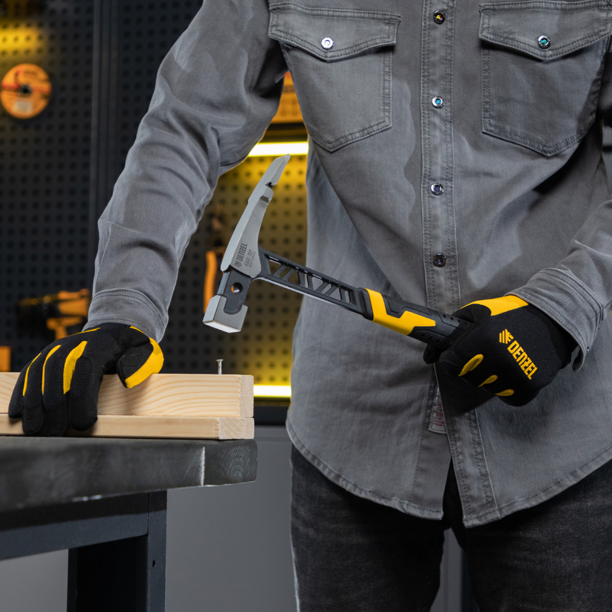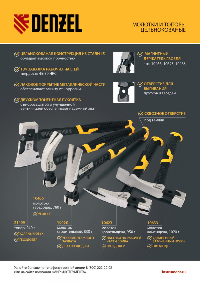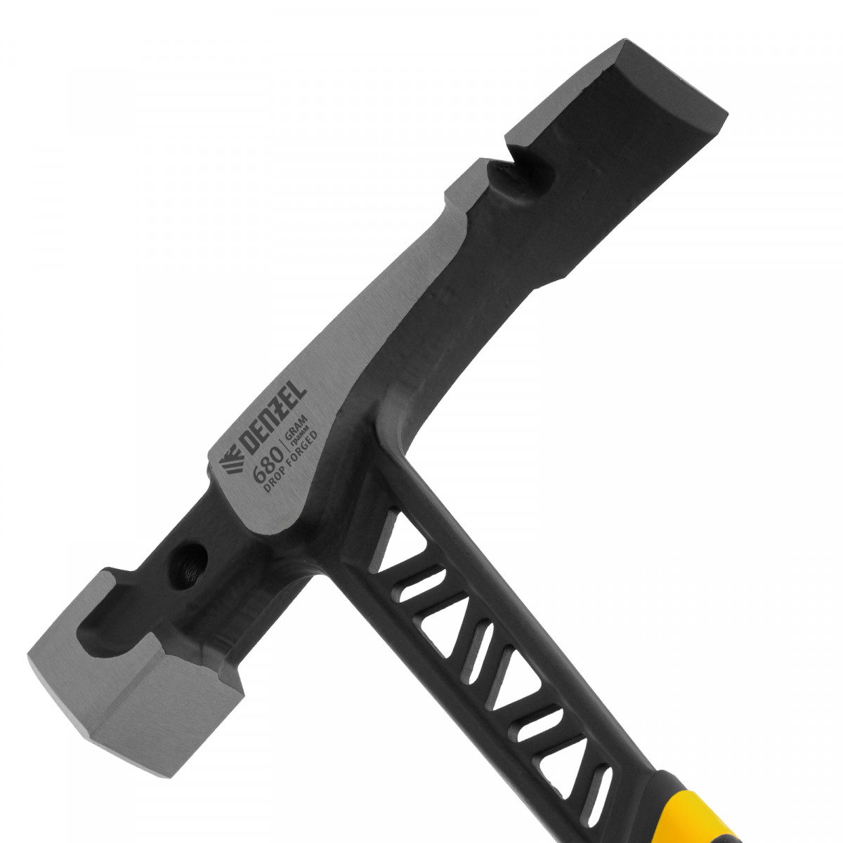 Цельнокованый молоток каменщика Denzel 10633 с бойком весом 680 г, с двухкомпонентной обрезиненной рукояткой, используется для выполнения работ с каменной или кирпичной кладкой. Квадратный боек предназначен для нанесения ударов, а удлиненный заточенный носок — для разрубания камня или кирпича. Гвоздодер применяется для выпрямления небольших гвоздей.