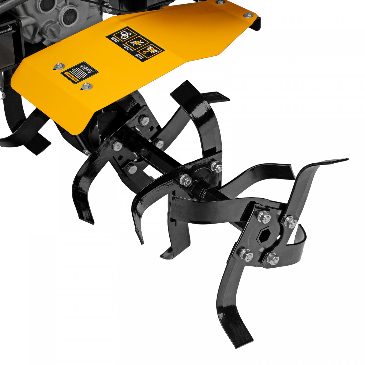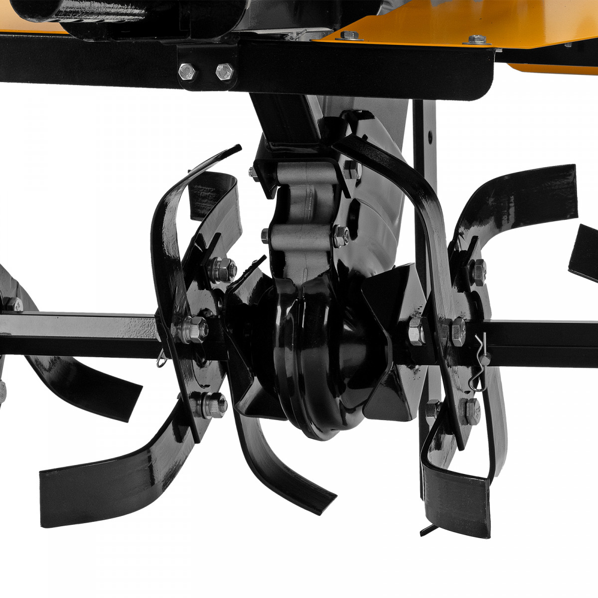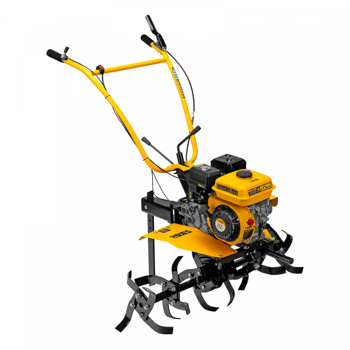 - Эффективная работа — благодаря усиленному шестеренчато-цепному редуктору с алюминиевым корпусом мотоблок успешно справляется даже с плотным, глинистым грунтом.
