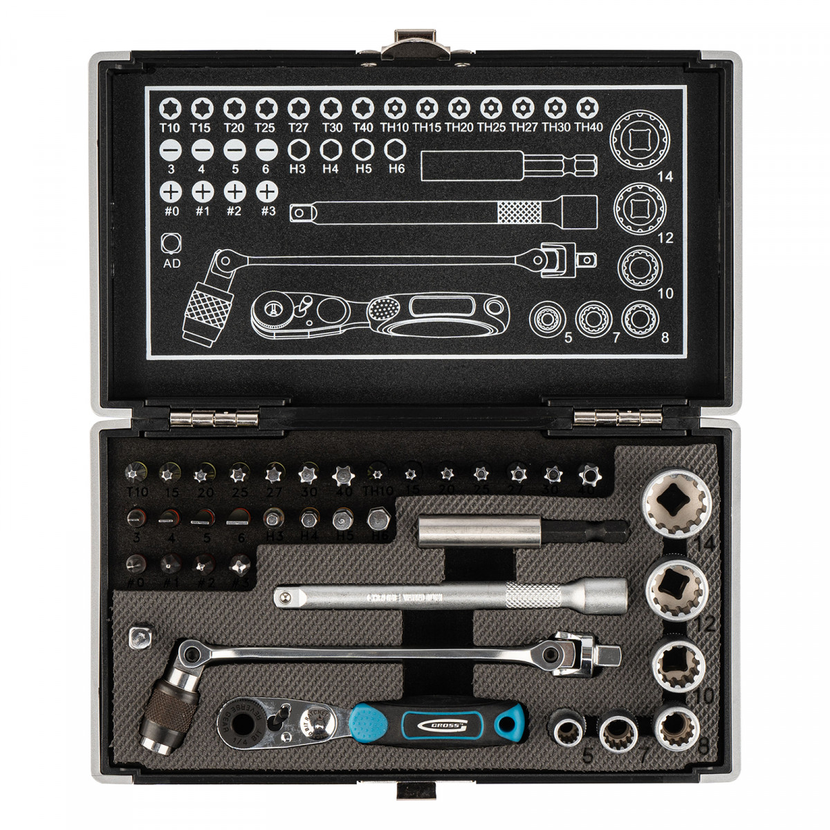 Набор Gross 11625 подходит для широкого спектра слесарно-монтажных работ, т.к. включает в себя 37 предметов из стали S2: трещотку, адаптер, карданный ключ, торцевые головки и биты с хвостовиком 1/4 дюйма. В комплекте биты следующих размеров: PH 0-3, Sl 3-6, TORX и ТТ 10, 15, 20, 25, 27, 30, 40, HEX 3-6, а также торцевые головки 5 мм, 7 мм, 8 мм, 10 мм, 12 мм, 14 мм. Набор используется для монтажа и демонтажа резьбовых крепежей. Пригодится во время сборки мебели, ремонта техники, а также дома или в гараже.