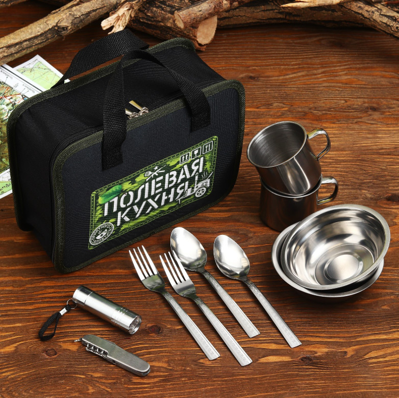Набор для пикника с сумкой — идеальное решение для комфортного отдыха на природе. В комплект входят 10 предметов: две тарелки, две кружки, две ложки, две вилки, фонарик и мультитул.Преимущества набора: - Многофункциональность: все предметы необходимы для полноценного отдыха на природе;