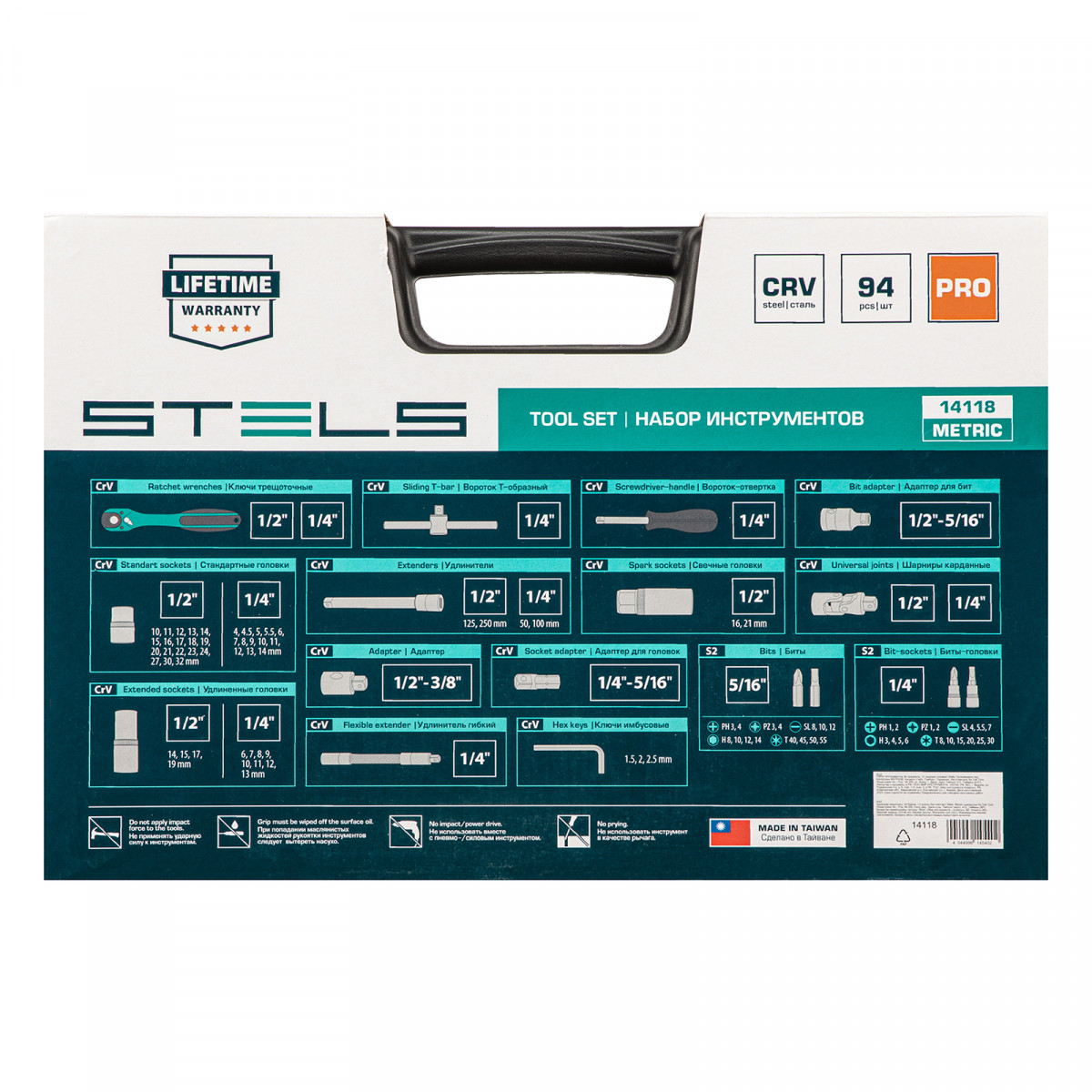 Набор инструментов 1/2", 1/4", CrV, 12 гранные головки, пластиковый кейс, 94 предмета Stels