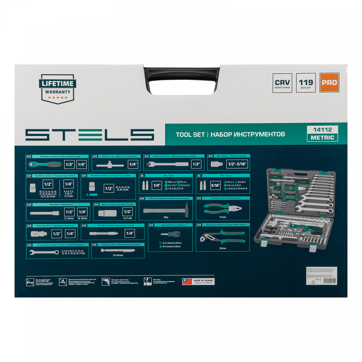 Набор инструментов Stels 14112 в ударопрочным пластиковом кейсе состоит из 119 предметов с присоединительными квадратами 1/2″ и 1/4″, из стали CrV и S2, и предназначен для выполнения слесарно-монтажных работ. Включает инструменты и насадки для работы с резьбовыми крепежами, а также удлинители (в том числе гибкий) и воротки, облегчающие работу в труднодоступных местах. Молоток, плоскогубцы и переставные клещи расширяют возможности использования набора. Набор предназначен для профессионального использования в автомастерской, будет полезен и для решения бытовых задач.