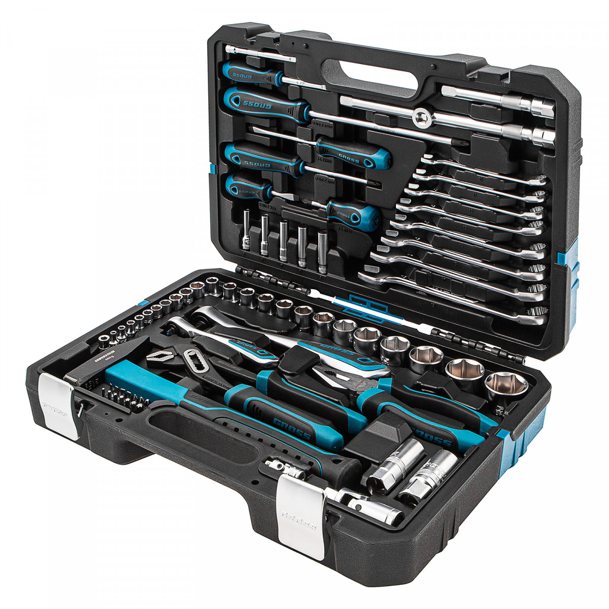 Набор инструментов Gross 14156 включает в себя 76 предметов, в том числе ключи-трещотки со 120 зубьями из стали CrV, с присоединительным размером 1/4" и 1/2". В комплекте инструменты для монтажа и демонтажа резьбовых соединений, молоток для ударных работ, а также переставные клещи и пассатижи, использующиеся для захвата и удержания деталей. Удлинители и карданные шарниры облегчают работу в ограниченном пространстве. Набор пригодится водителям, сотрудникам автосервисов, а также домашним мастерам.