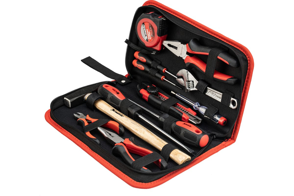 Набор , будет полезен как частным мастерам, так и профессионалам для проведения слесарно-монтажных работ. Он включает отвертки для монтажа/демонтажа резьбовых соединений, в том числе и мелких, разводной ключ для болтов и гаек, нож для резки плотных материалов, рулетку для проведения замеров, молоток, кусачки, и тестер напряжения.Особенности набора