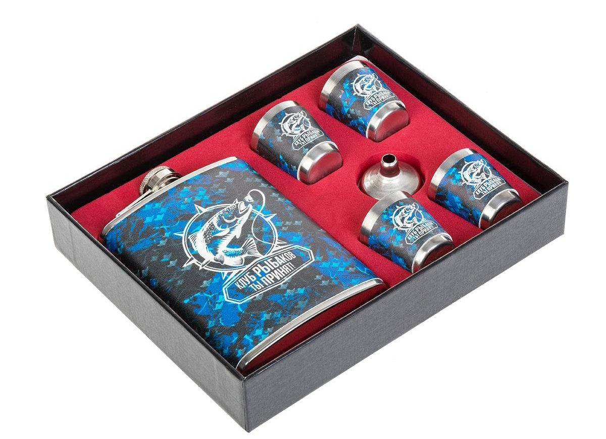 В подарочный набор "Клуб рыбаков" входит: фляжка (240 мл) декорированная паттерном Shark, 4 стопки и воронка.