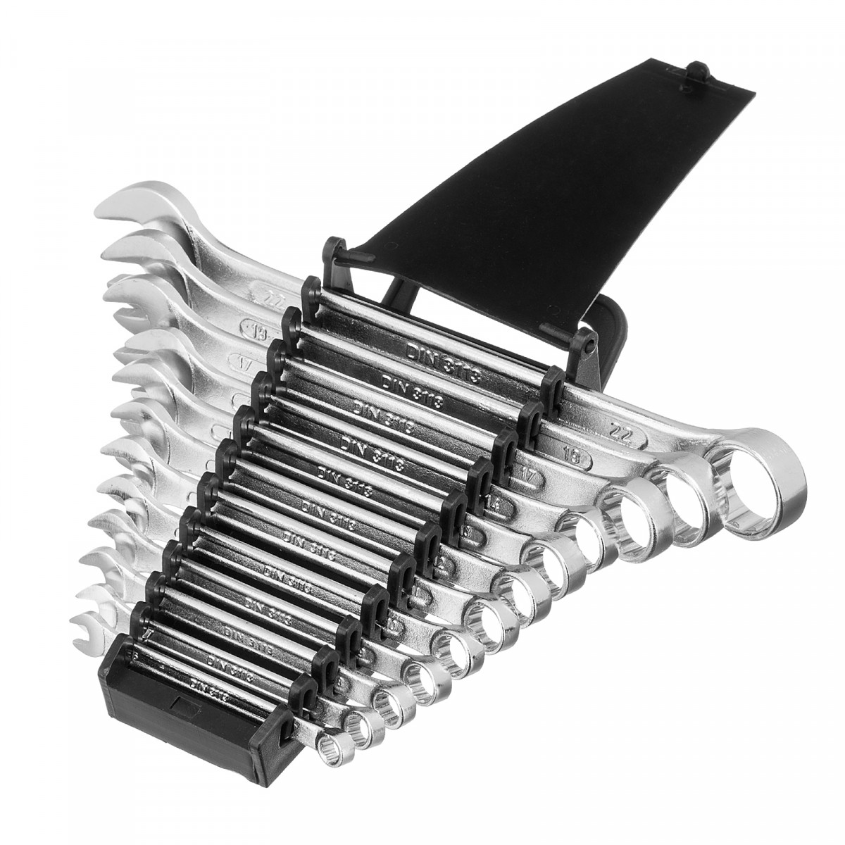 Набор комбинированных ключей Сибртех 15452 включает в себя 12 инструментов из стали CrV для работы с резьбовыми крепежами диаметром от 6 до 22 мм. Каждый ключ снабжен рожковым и 12-гранным кольцевым зевом, который максимально плотно соприкасается с поверхностью гайки или болта — это уменьшает риск ее деформации. Набор незаменим при ремонте автомобиля, а также будет полезен для сборки техники или решения бытовых задач.