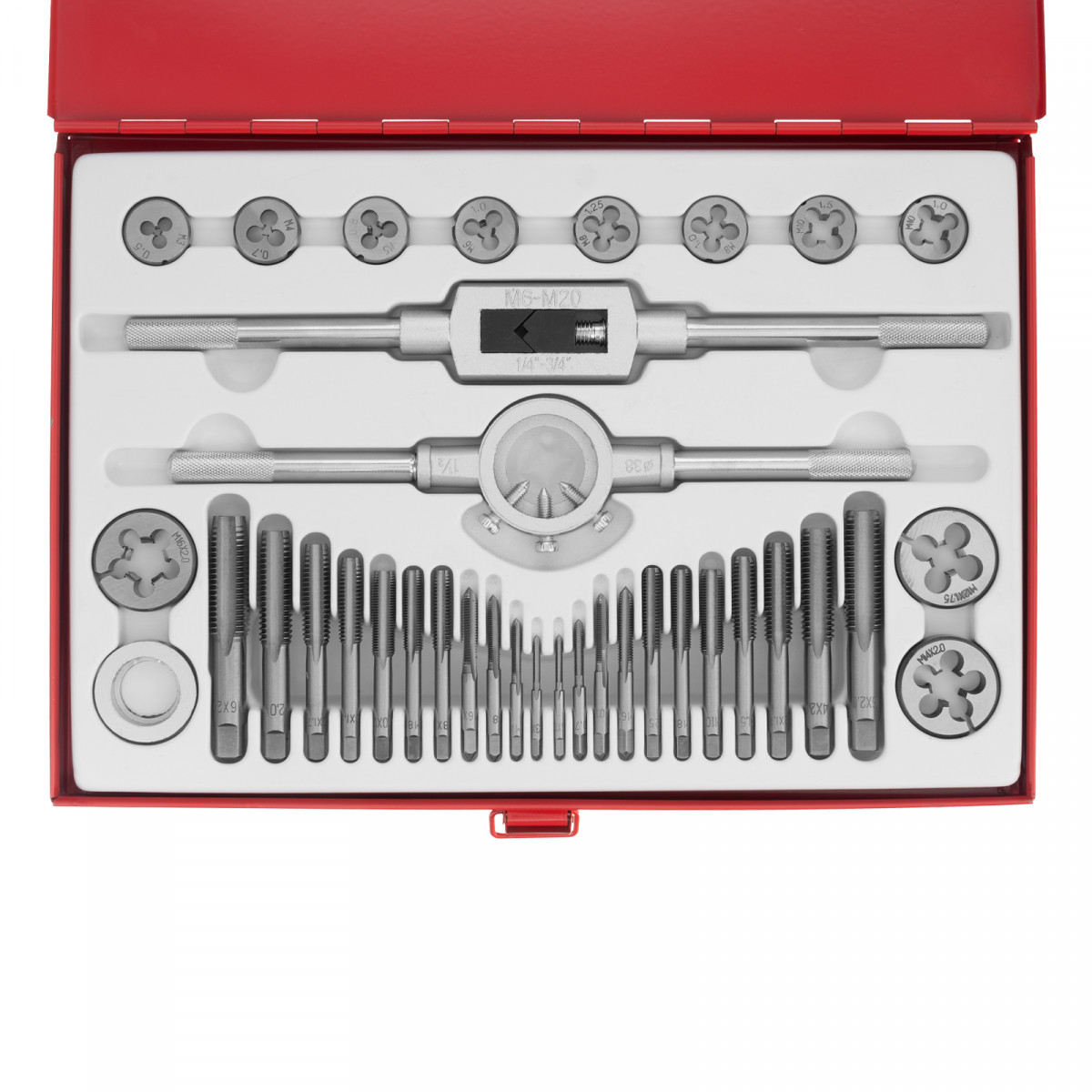 Набор метчиков и плашек М3-М16 Matrix 77339 состоит из 36 предметов — резьбонарезных инструментов, воротка и плашкодержателя с переходником. Используется для создания наружной и внутренней резьбы в сквозных и глухих отверстиях металлических деталей. Также с его помощью можно восстанавливать поврежденные резьбовые участки. Набор поставляется в металлическом кейсе, поэтому не потеряется при хранении или транспортировке. Будет полезен в слесарной мастерской, а также пригодится для проведения бытового ремонта.