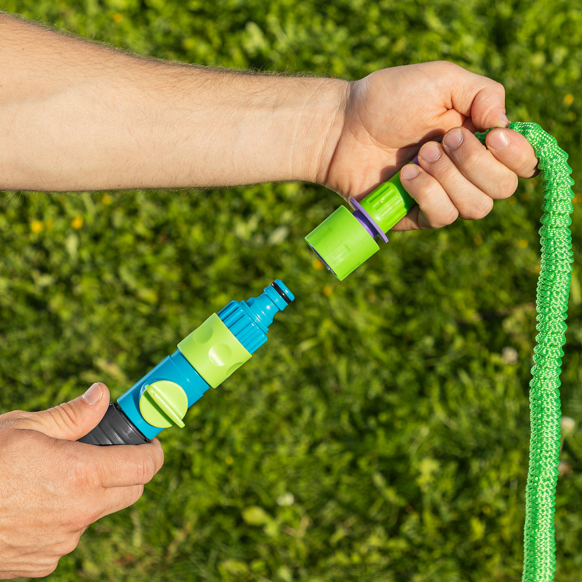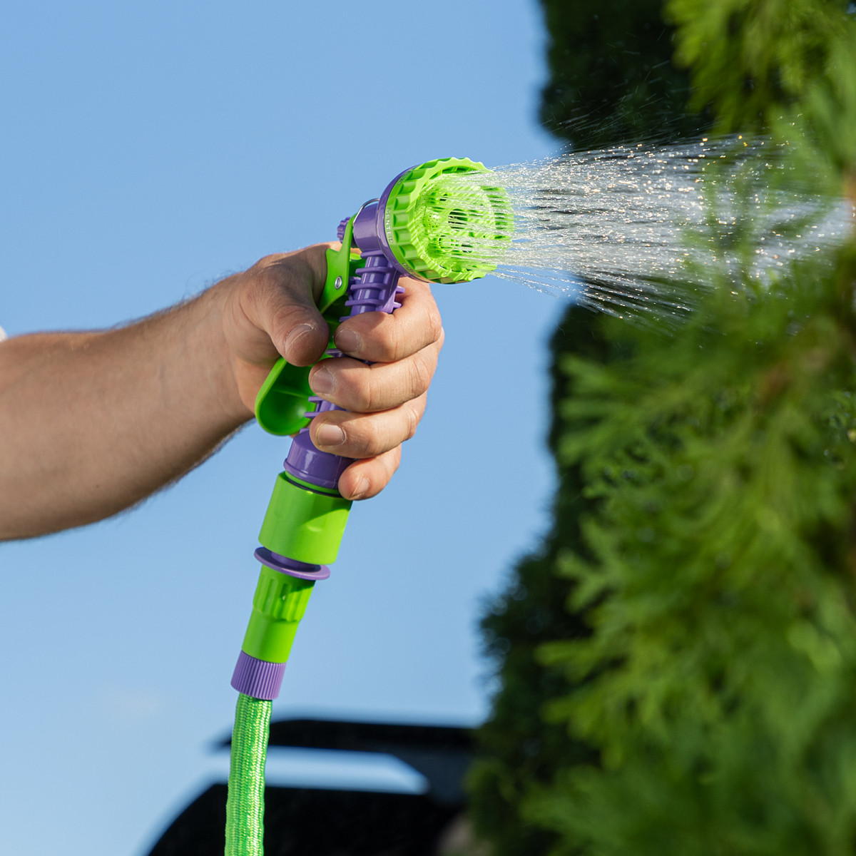 - Охват значительной площади полива — в растянутом состоянии длина шланга достигает 15 м.