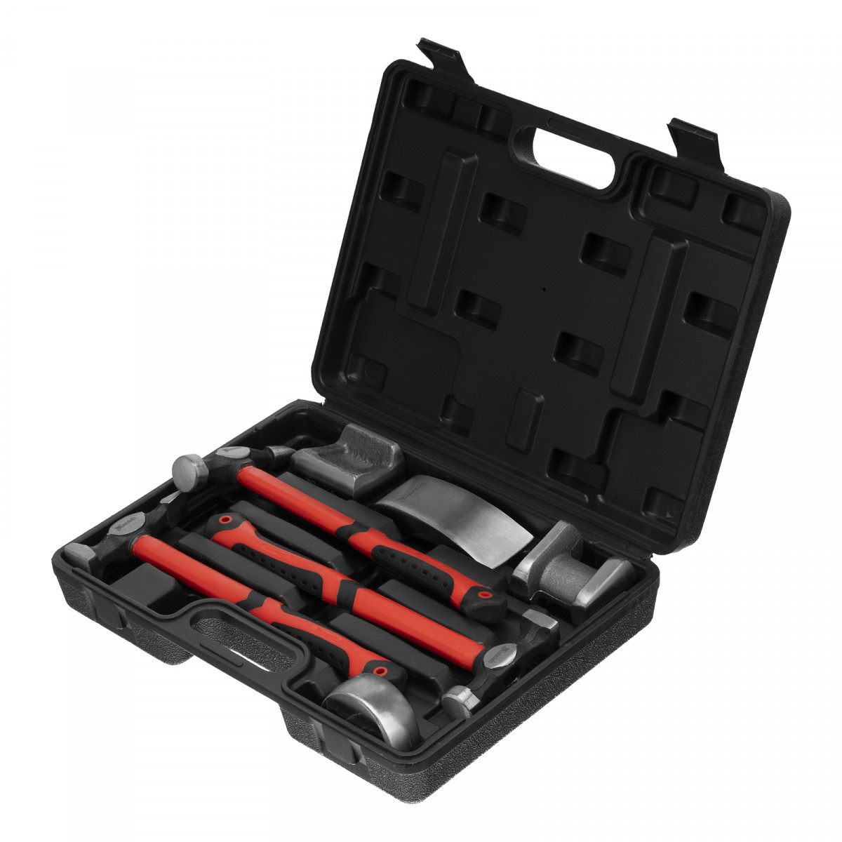 Рихтовочный набор Matrix 10845, включающий 3 молотка с фибергласовыми ручками и 4 наковальни, предназначен для исправления геометрии элементов автомобильного кузова. Наковальни и ударные головки имеют различную форму, что позволяет работать с деталями разной степени кривизны. Набор используется в автомастерских.