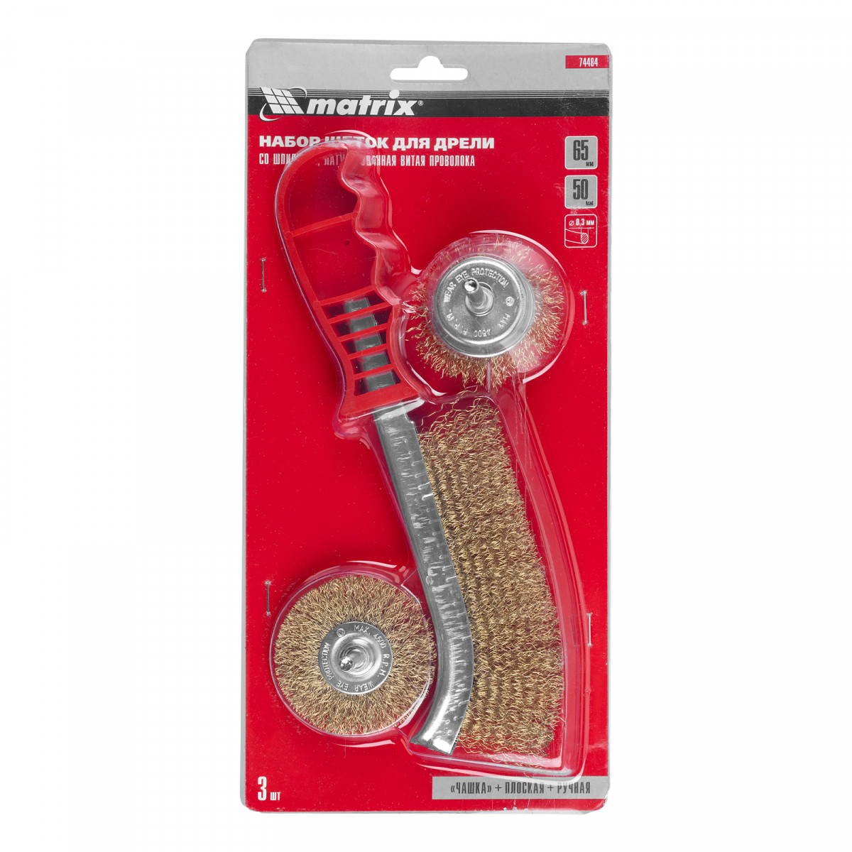 Набор щеток для дрели, 3 шт, 1 плоская, 65 мм, 50 мм "чашка", ручная металлическая Matrix