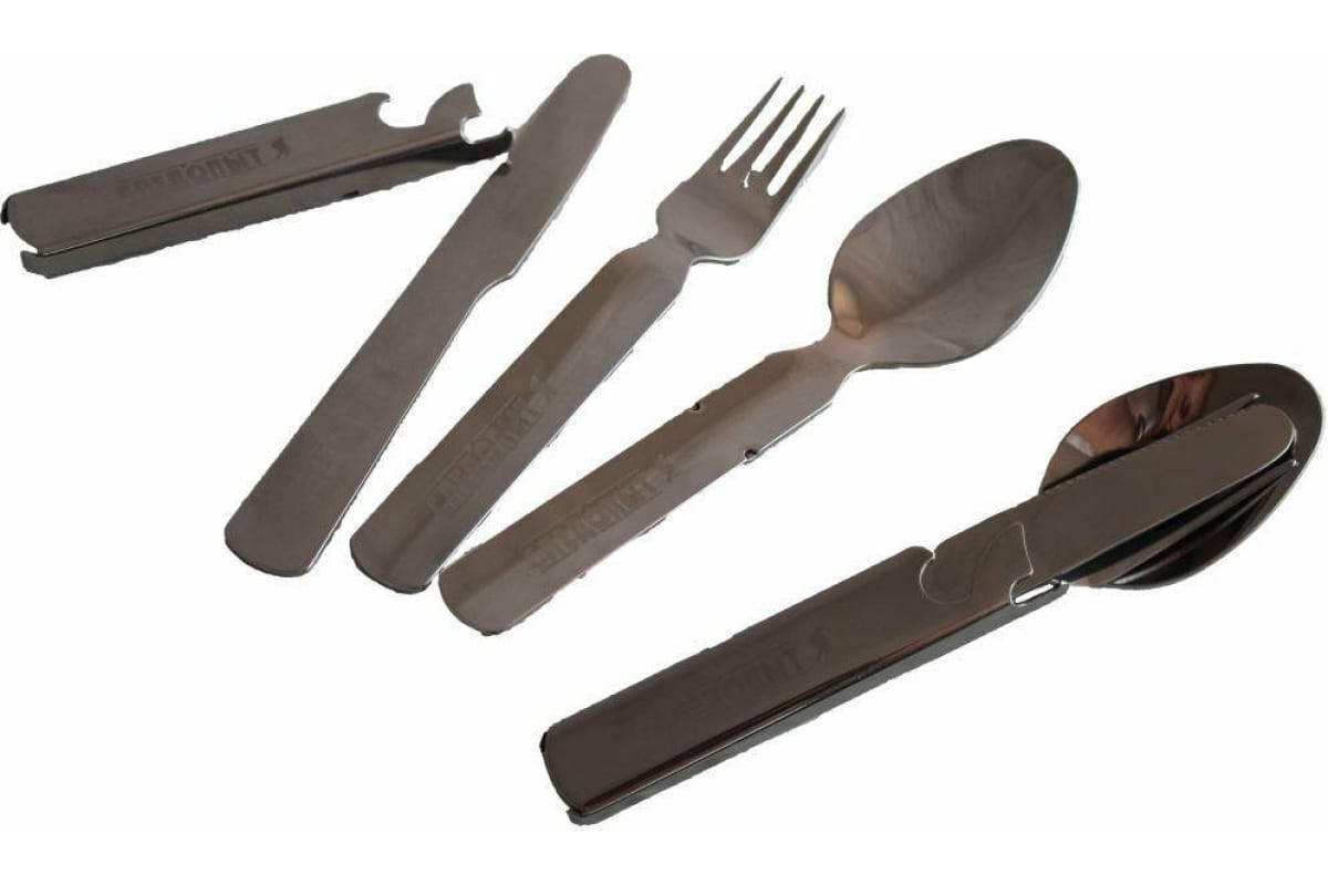 Набор столовых приборов в металлическом чехле Следопыт ложка, вилка, нож, открывашка PF-CWS-P59 пригодится в походе или на пикнике.
