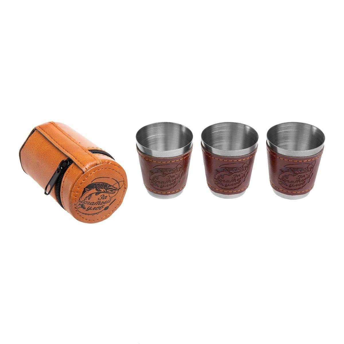 Набор из 3 стопок в кожаном чехле. Стопки декорированы полосой из искусственной кожи, с рисунком.Характеристики:• Материал стопок – нержавеющая сталь.