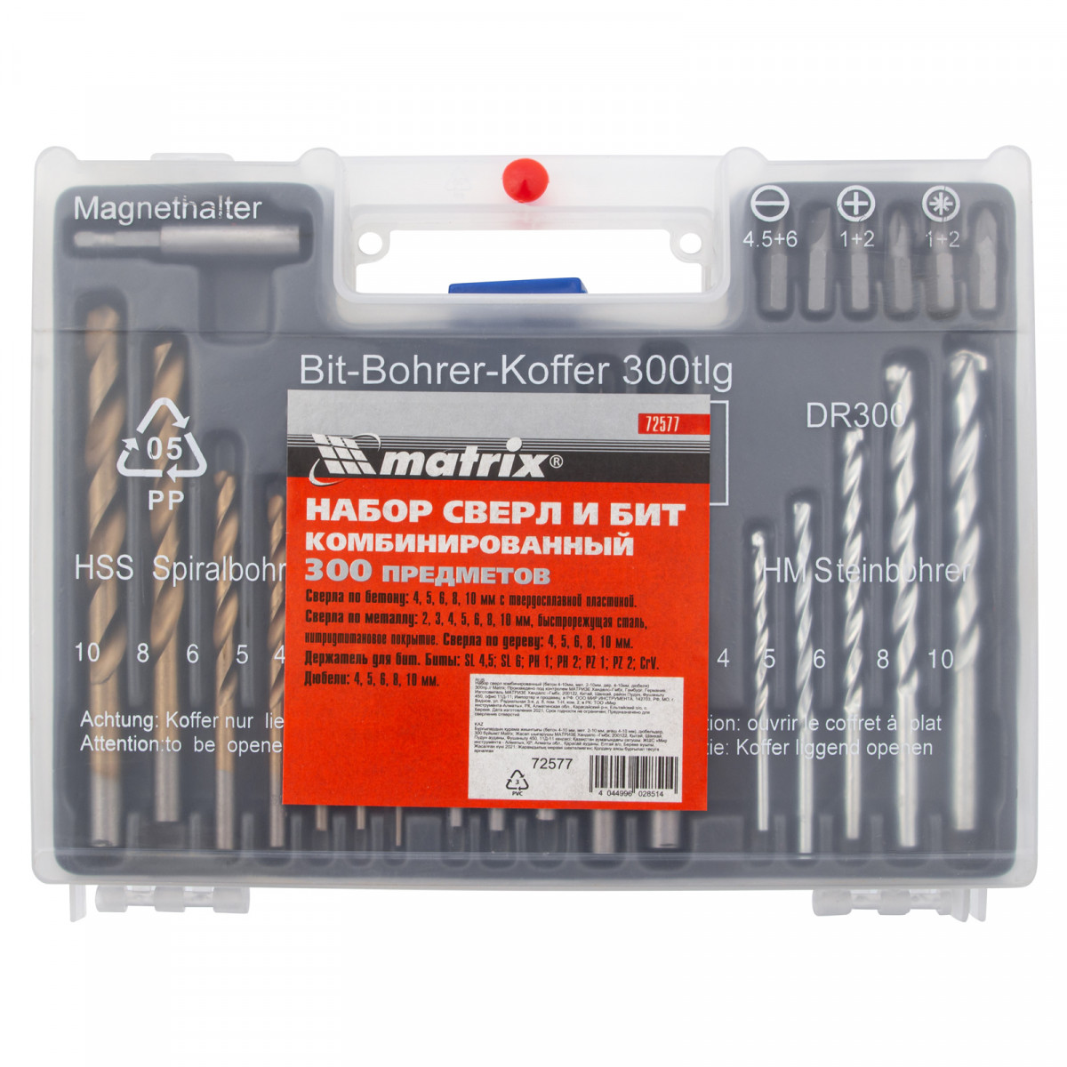 Комбинированный набор Matrix 72577 — универсальное решение для мастеров, т.к. он содержит 300 предметов: дюбели, отверточные биты, сверла по дереву 4-10 мм, сверла по бетону 4-10 мм и сверла по металлу 2-10 мм. Оснастка рассчитана на бытовое использование.