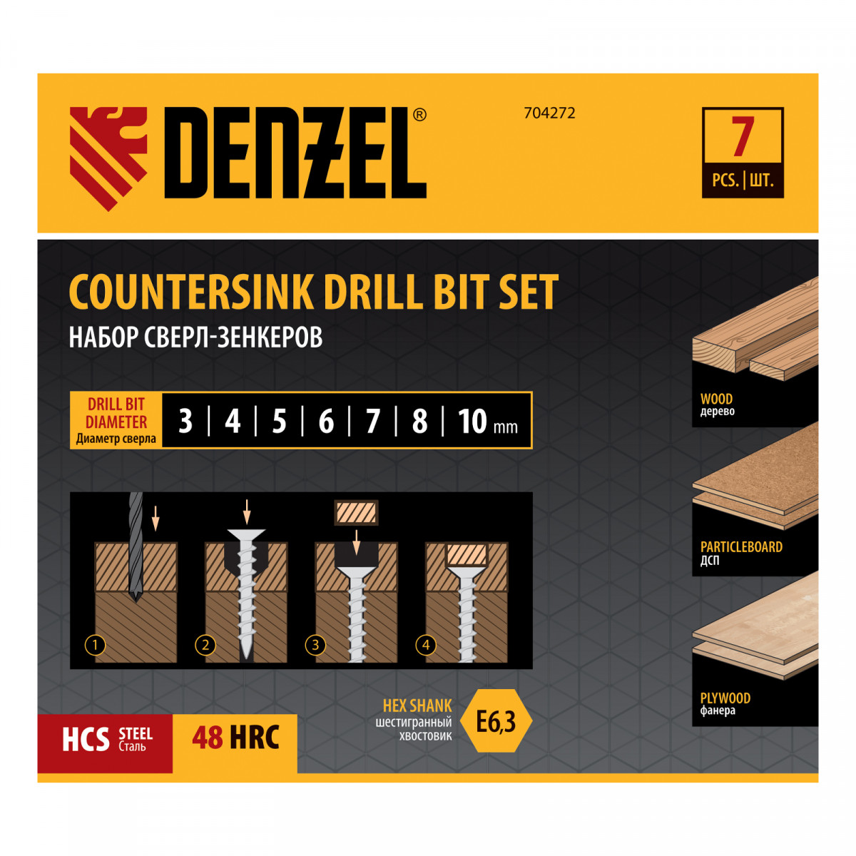 Набор сверл зенкеров по дереву, 3-10 мм, 7 шт Denzel
