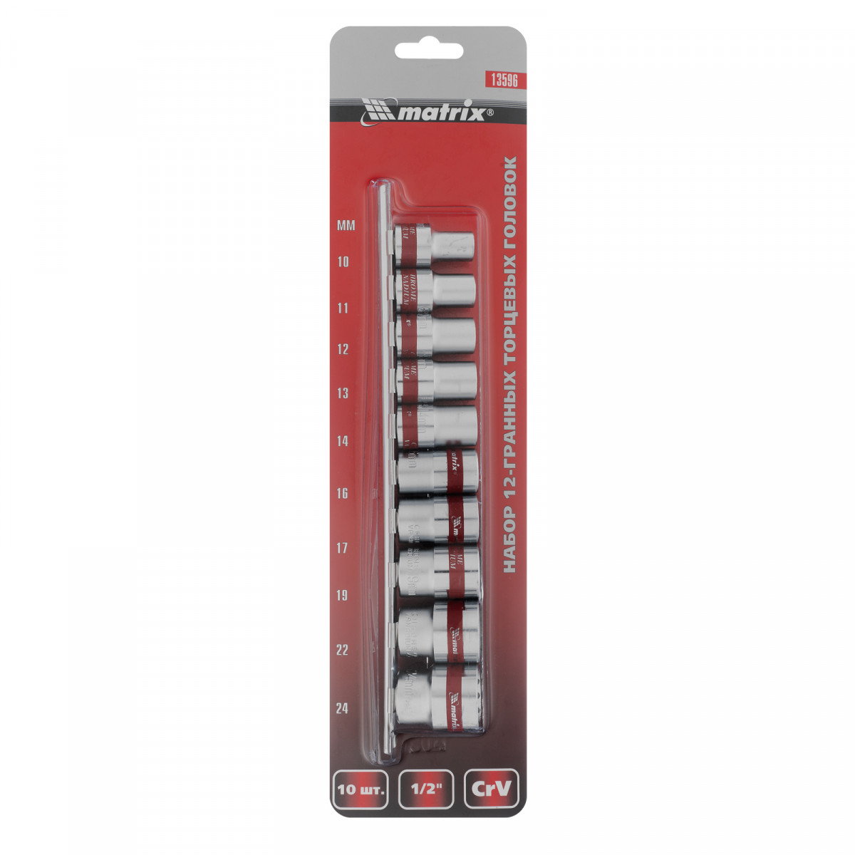 Набор торцевых головок, 1/2", 12 гранные, CrV, 10-24мм, 10 штук Matrix