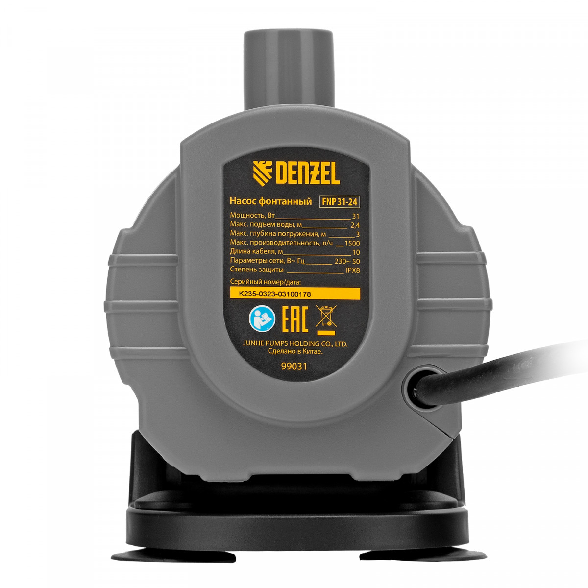 Насос фонтанный FNP31-24, 31 Вт, подъем 2,4 м, 1500 л/ч, колокольчик/2 каскада/гейзер Denzel