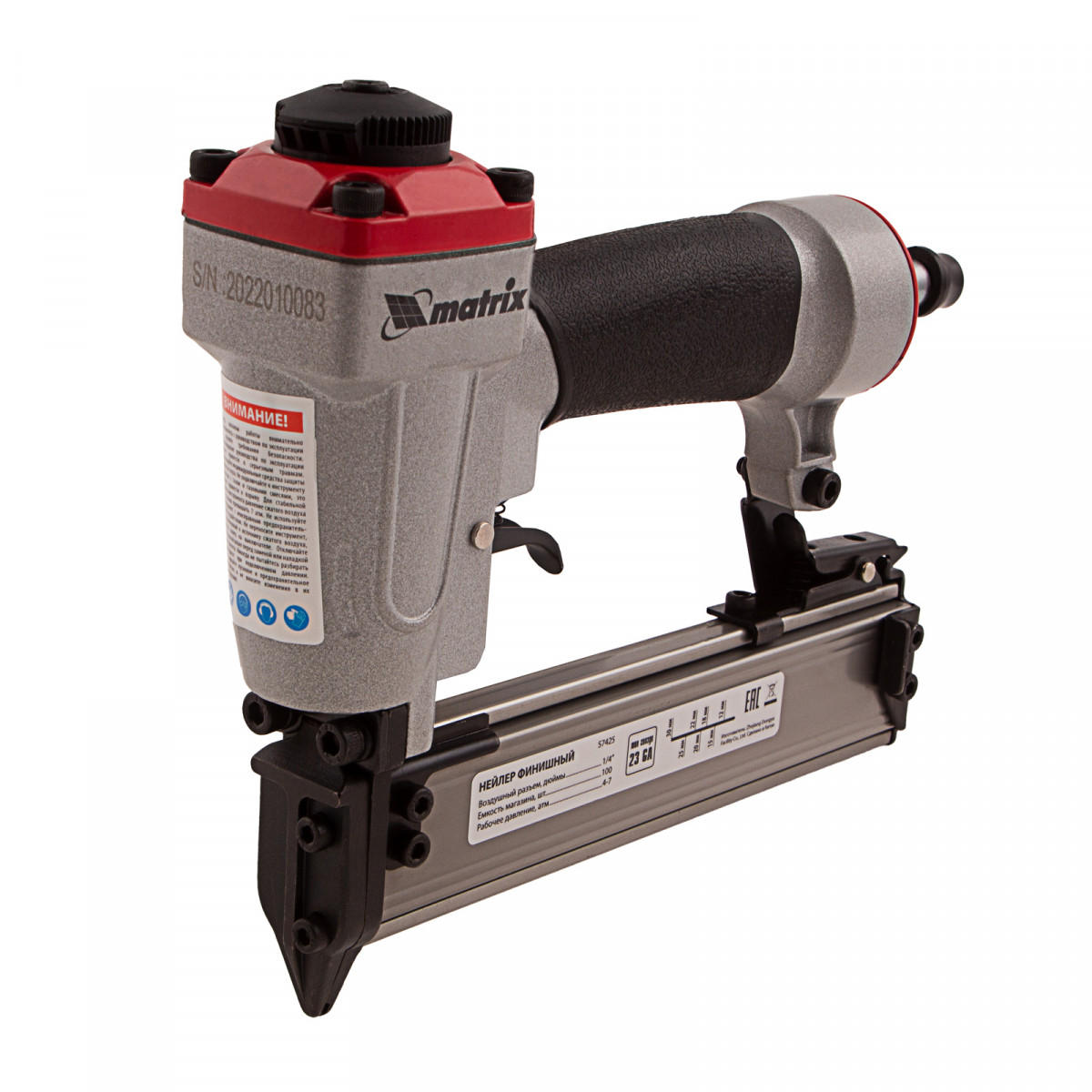 Пневматический финишный нейлер Matrix 57425 (шпилькозабивной пистолет) предназначен для забивания гвоздей 23GA диаметром 0,64 мм и длиной 10-30 мм. Он используется для финишной отделки, а также сборки мебели и производства упаковки. Благодаря низкому расходу воздуха 0,7 л/мин нейлер совместим с любым типом компрессоров.