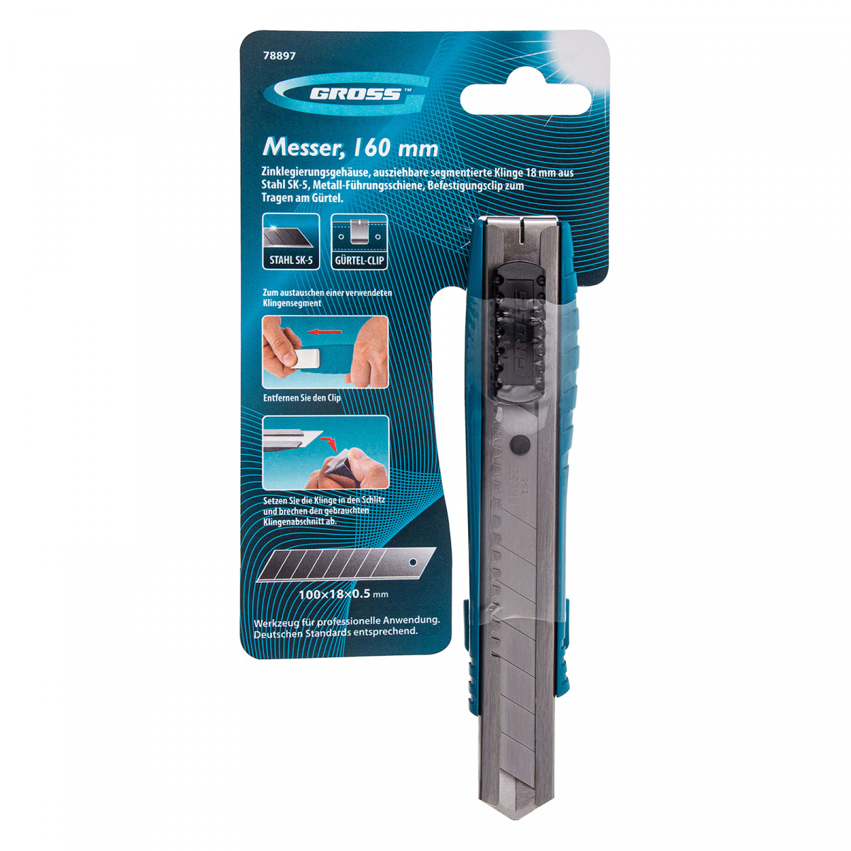 Нож Gross 78897 из стали SK-5, длиной 160 мм, в металлическом корпусе, с выдвижным сегментным лезвием шириной 18 мм, металлической направляющей и клипсой для ремня, — профессиональный инструмент, предназначенный для разрезания линолеума, картона, кожи, обоев и других материалов. Используется при проведении ремонтных и отделочных работ, будет полезен в хозяйстве.