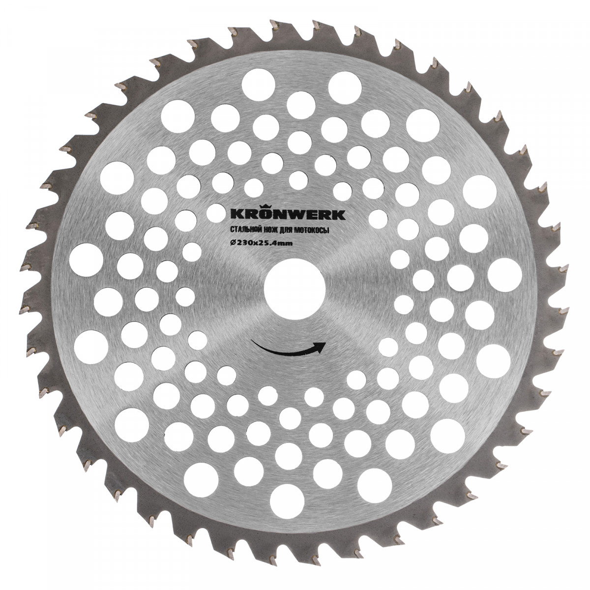 Нож для триммера Kronwerk 96343 размером 230 х 25,4 мм, толщиной 1,3 мм, с 40 зубьями, предназначен для скашивания травы всех типов, в том числе травы с толстыми жесткими древовидными стеблями (полыни, крапивы, лебеды, борщевика), а также кустарника и молодых побегов деревьев с диаметром стволов до 10 мм.Преимущества: - Универсальное применение — диск рекомендован к использованию со всеми типами бензиновых триммеров, а также с электрическими триммерами. - Эффективное использование — при скашивании травы создается минимальная вибрация. - Высокое качество — диск из прочной стали 50 толщиной 1,3 мм выдерживает ударные нагрузки и отличается износостойкостью. - Долговечность — 40 твердосплавных зубьев закалены до высокой твердости 80 HRC.