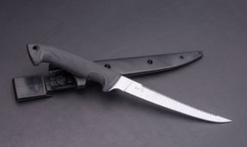 Изогнутая форма клинка с агрессивным серрейторным лезвием для эффективного разделывания рыбы.