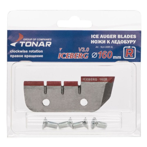 "Ножи к ледобуру ICEBERG 160R v3.0 (диаметр бурения 160 мм, правое вращение). Материал: высокоуглеродистая легированная сталь. Высокая твердость – 55-60 HRC. В комплекте с ножами идут 4 крепёжных болта. Группа компаний ""ТОНАР"" провела серьезную технологическую модернизацию производства ножей к ледобурам: - приобретено высокотехнологичное итальянское шлифовальное оборудование марки MVM ""La 500""; - введена дополнительная операция финишной шлифовки (""доводка"") лезвия всех ножей: теперь лезвие ножа идеально острое и держит заточку намного дольше; - лезвие ножей обрабатывается специальным защитным составом, который разработан для оборонной промышленности. Определить такие ножи очень легко: на их режущей кромке имеется красная полоса с логотипом ICEBERG, которую хорошо видно через новую блистерную упаковку ножей. "