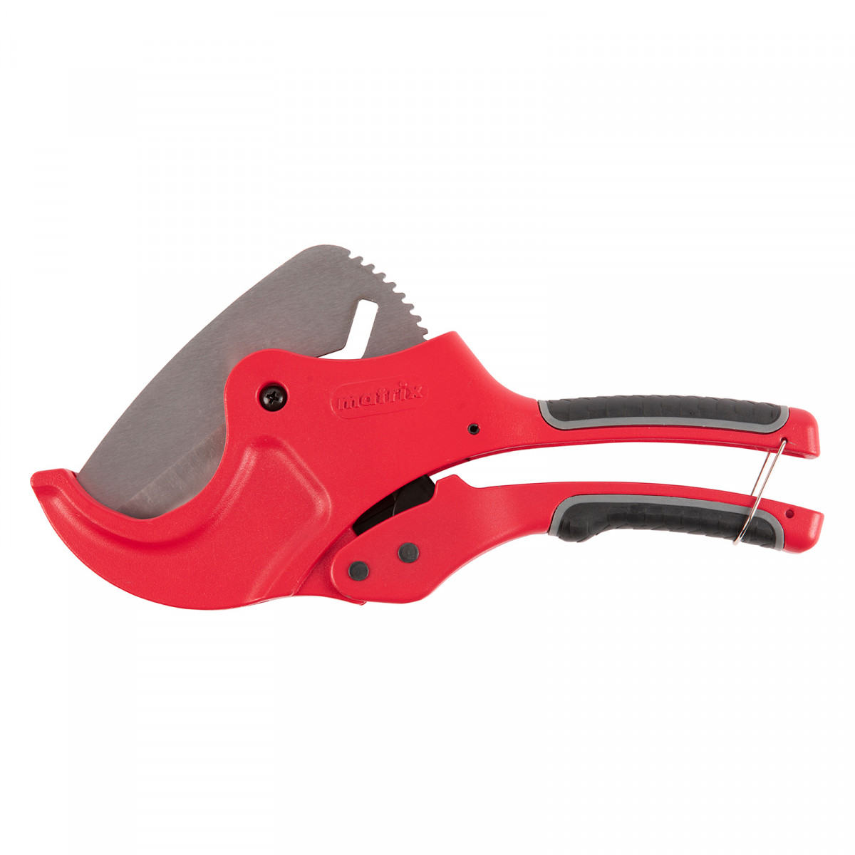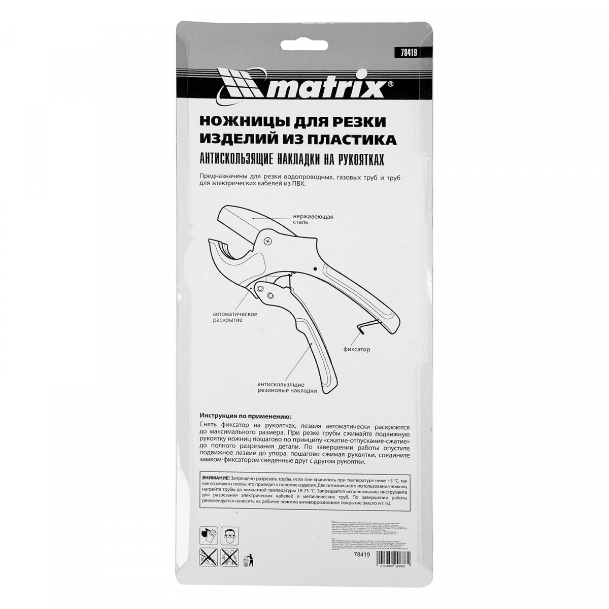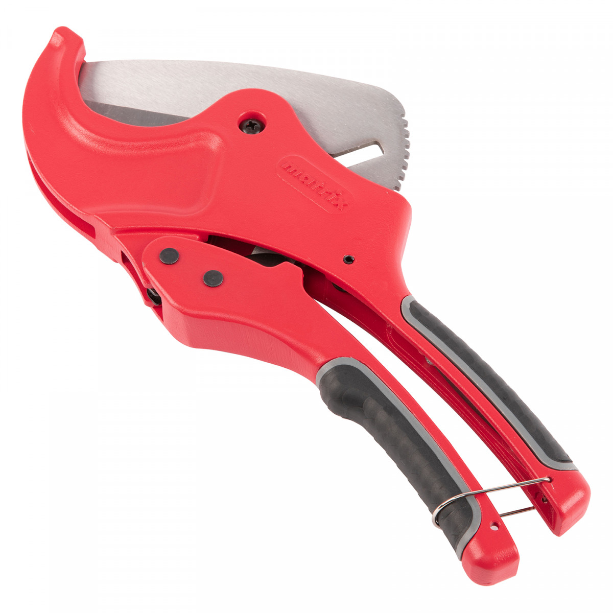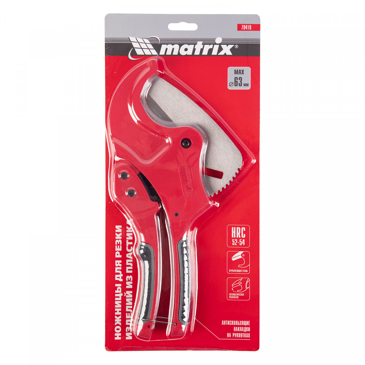 Ножницы для резки изделий из ПВХ Matrix 78419 с лезвием из нержавеющей стали и функцией автоматического раскрытия применяются для работы с пластиковыми трубами диаметром до 63 мм, а также для разрезания профилей, плинтусов, галтелей, реек, планок, резиновых шлангов и других предметов. Прямой нож инструмента позволяет резать плоские заготовки. Ножницы пригодятся для выполнения сантехнических и отделочных работ., , Преимущества, Прочность и долговечность — режущее полотно изготовлено из нержавеющей стали 3CR13., Защита от коррозии — на корпус нанесено порошковое покрытие., Высокая эффективность — механизм автоматического раскрытия позволяет выполнять работу быстрее, не прикладывая больших усилий., Комфортная работа без ощущения усталости — храповой механизм минимизирует прикладываемые усилия., Безопасное хранение и транспортировка — рукоятки можно заблокировать в сведенном положении., , Для корректной работы инструмента, чтобы предотвратить перекос лезвия относительно ПВХ-трубы, рекомендуется, чтобы отрезаемая часть была больше или равна внешнему диаметру ПВХ-трубы. В противном случае может возникнуть перекос лезвия, что также может привести к поломке лезвия/инструмента.