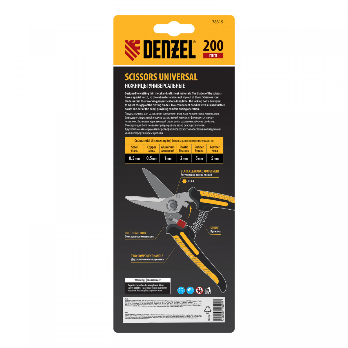Универсальные ножницы Denzel 78319 длиной 200 мм — инструмент для разрезания тонкого металла и мягких материалов. Одно из лезвий имеет серрейторную (зубчатую) заточку, поэтому разрезаемый материал не выскальзывает из инструмента. Ножницы подходят для выполнения разнообразных работ: на даче помогут разрезать стальную сетку с небольшим диаметром проволоки, в походе — ветки или рыбу, во время мелкого ремонта или занятий творчеством — провода, кожу, резину, картон, бумажную лозу и другие материалы.