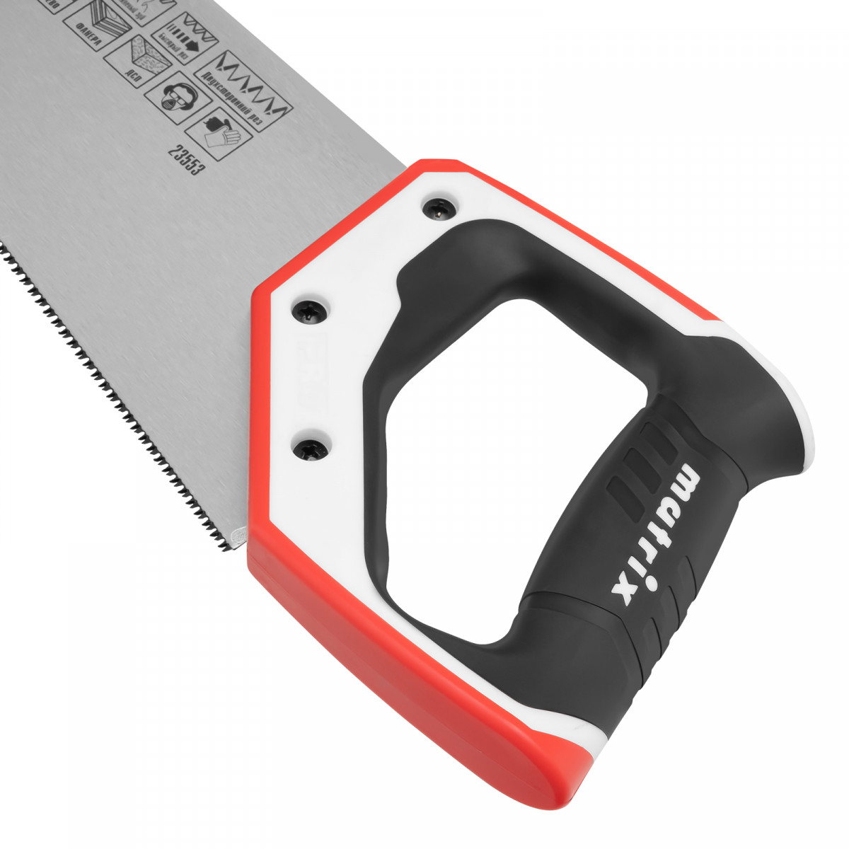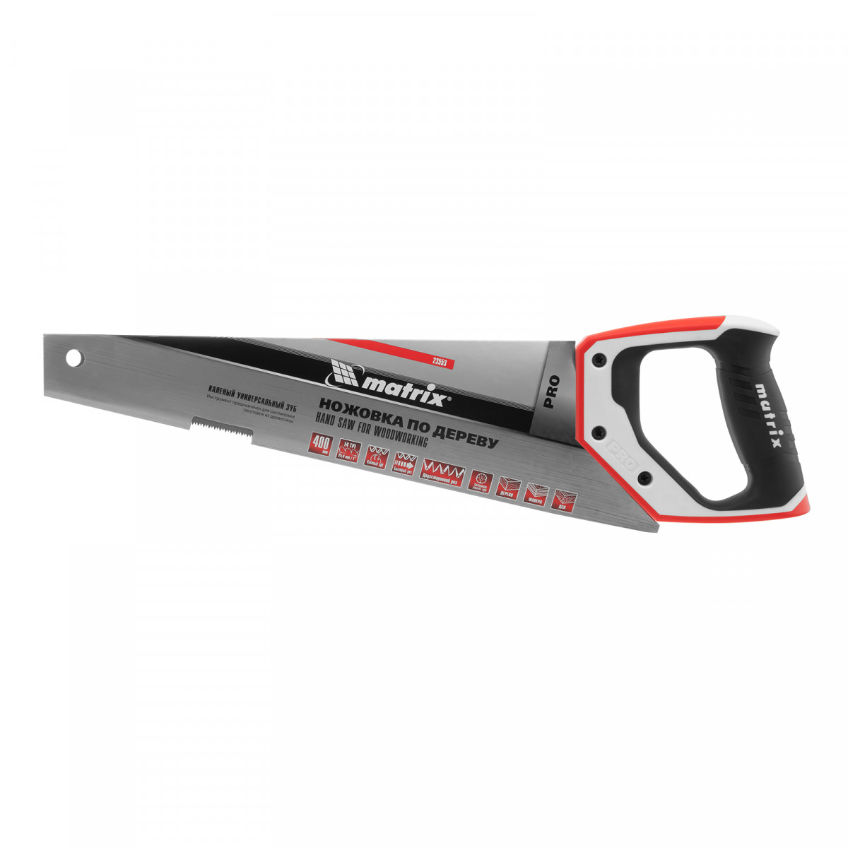 Ножовка по дереву Matrix PRO 23553 с полотном длиной 400 мм, калеными зубьями с шагом 14 TPI и 3D-заточкой, с трехкомпонентной рукояткой, предназначена для точных пильных работ с заготовками из древесины, фанеры и ДСП. Подходит для продольного и поперечного пиления. Шаг зубьев составляет 14 TPI, что обеспечивает точность реза. 3D-заточка зубьев увеличивает производительность ножовки. Инструмент будет полезен в столярной мастерской, а также пригодится в быту.