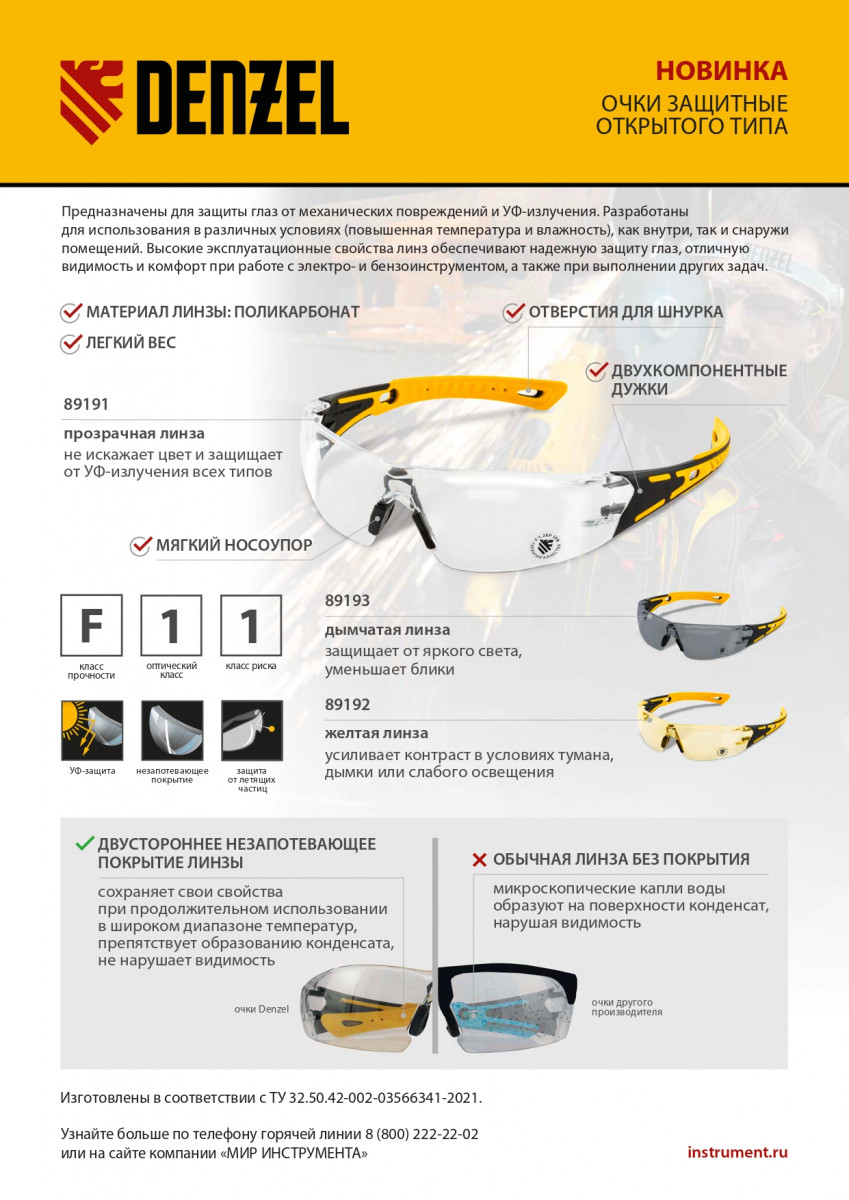 Легкие универсальные защитные очки открытого типа Denzel 89191 с поликарбонатными прозрачными линзами и 2-компонентными дужками предназначены для защиты глаз от механических повреждений и УФ-излучения. Очкам присвоен класс механической прочности F, они обеспечивают защиту от высокоскоростных частиц с низкоэнергетическим ударом V=45 м/с. Очки используются во время работы с электро- и бензоинструментом, на производстве и в быту.