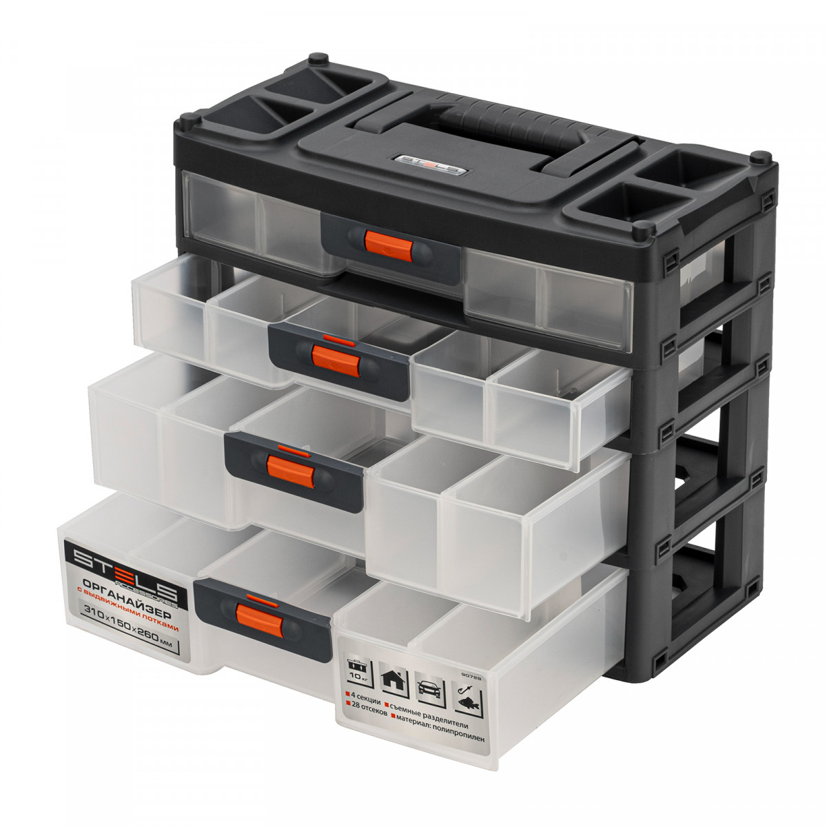 Органайзер для хранения с выдвижными лотками 310х150х260мм, 4 секции, пластик Stels