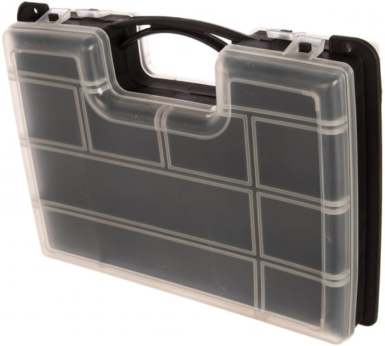 Двухсторонний органайзер 29,5 х 22 х 7,6 см СИБРТЕХ 90738 удобен для хранения и транспортировки небольших объемов крепежа, шайб, прокладок и иных мелочей.Для практичности крышка выполнена из полупрозрачного пластика.