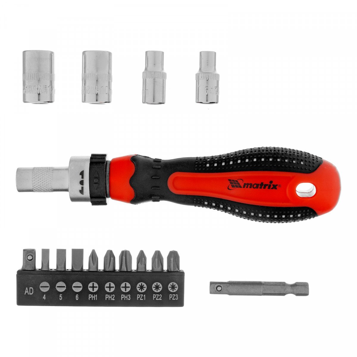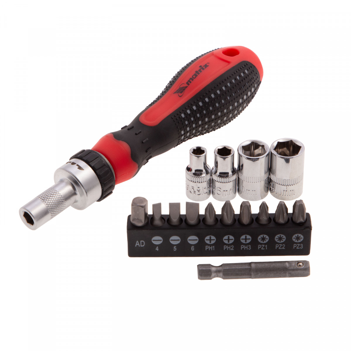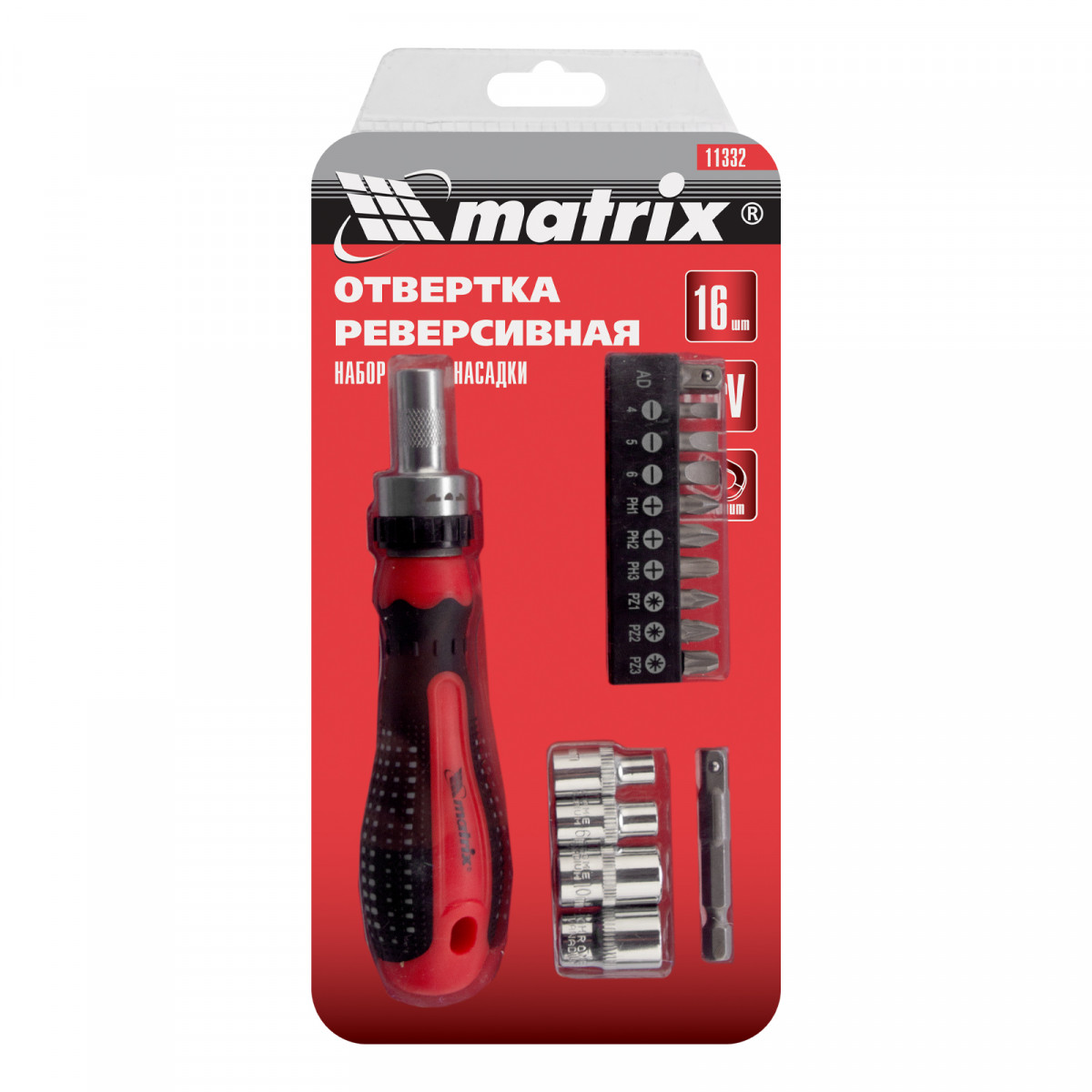 Отвертка реверсивная с набором бит и насадок торцевых, CrV, 1/4, 16 шт Matrix