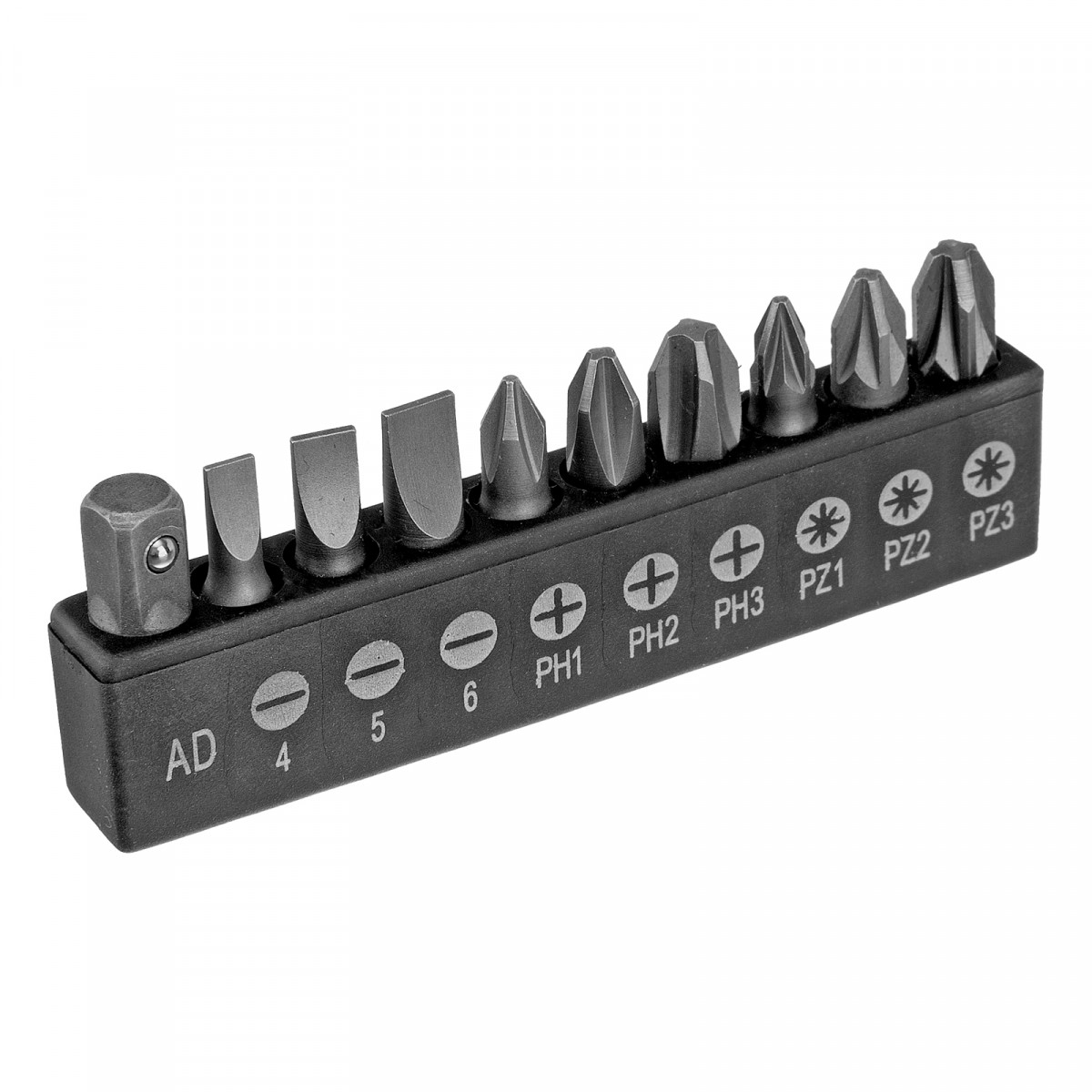 - Быстрый поиск нужной насадки — для бит предусмотрена плашка-держатель с маркировкой размеров и типов шлицев.