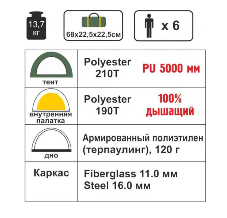Внешний тент изготовлен из полиэстера (polyester 210T) и имеет специальную пропитку, которая придаёт ему прочность и долговечность, а также защищает от выгорания и преждевременного износа. Водоотталкивающее покрытие тента (PU) – 5000мм. Все швы проклеены.