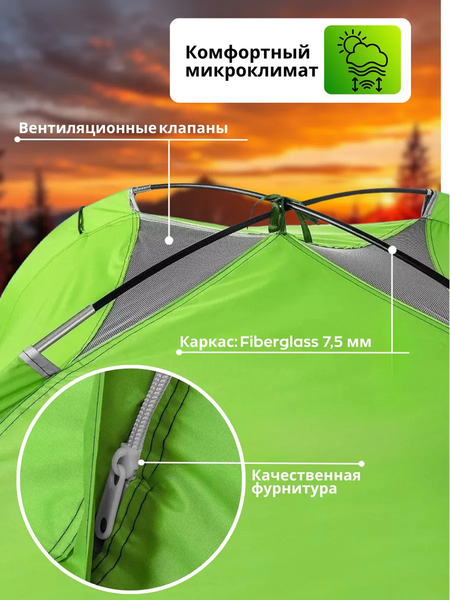 Фиберглассовый каркас обеспечивает легкость палатки при сохранении ее прочности.
